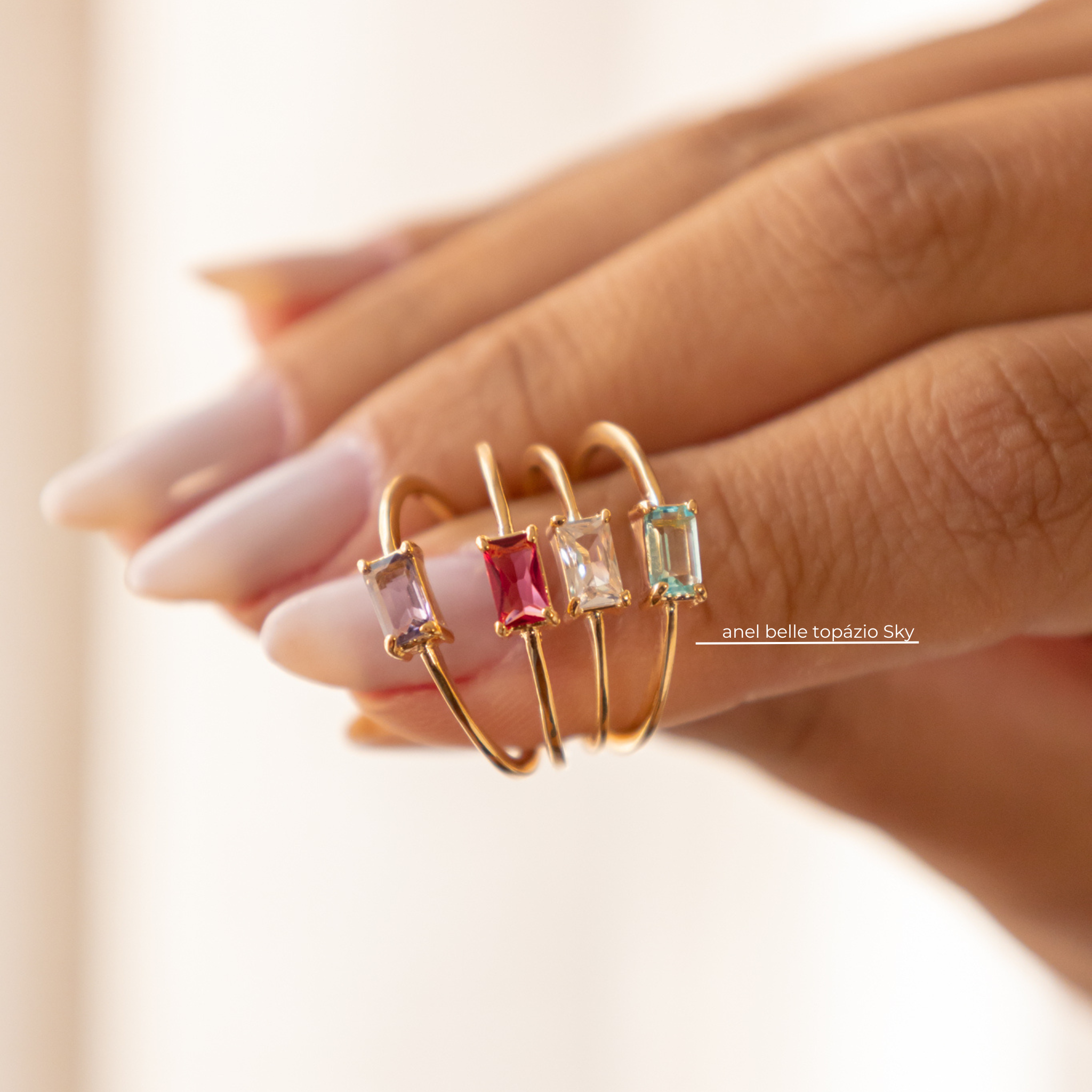Nosso anel é banhado a ouro 18 quilates com pingente de cristal, garantindo um brilho sofisticado e duradouro. Além disso, ele possui uma camada extra de proteção, desenvolvida especialmente para minimizar o risco de alergias, proporcionando conforto e segurança ao usá-lo.
