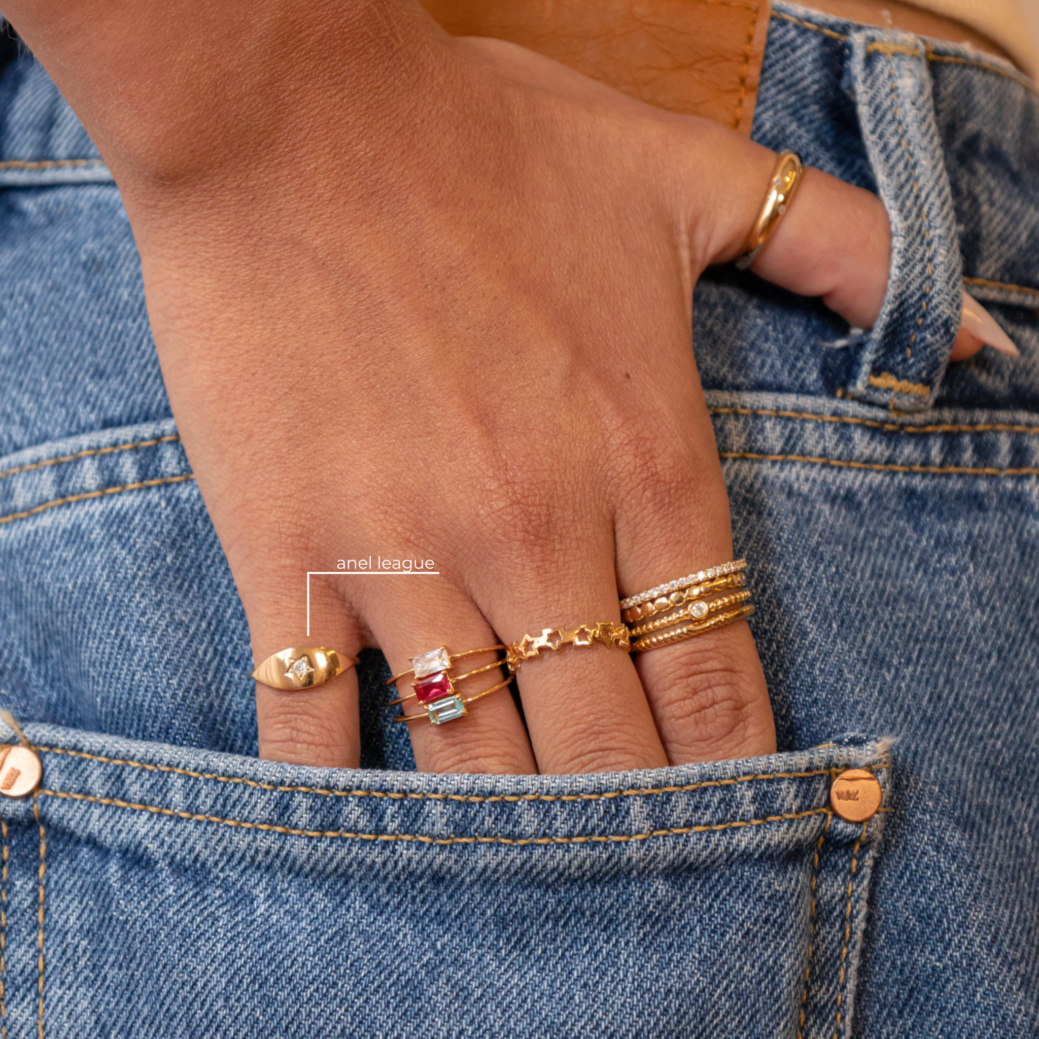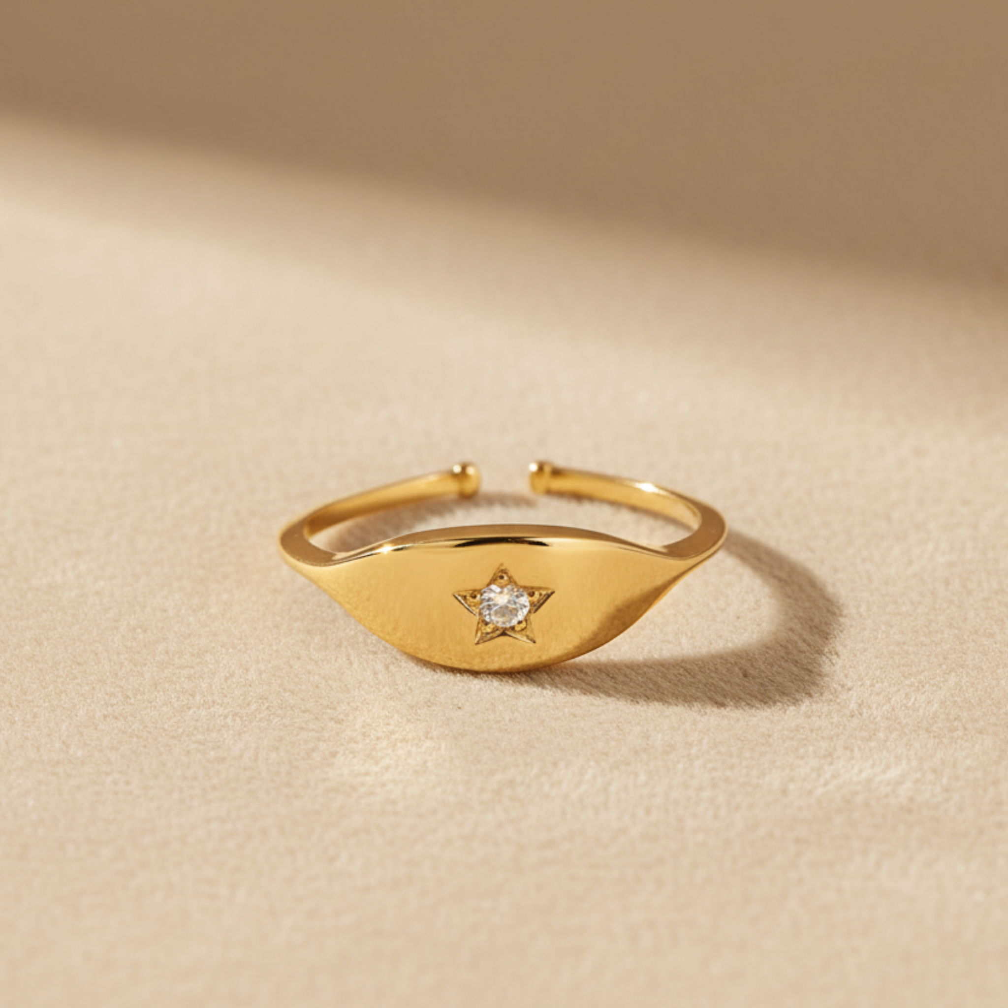 Nosso anel é banhado a ouro 18 quilates com estrela de zircônia, garantindo um brilho sofisticado e duradouro. Além disso, ele possui uma camada extra de proteção, desenvolvida especialmente para minimizar o risco de alergias, proporcionando conforto e segurança ao usá-lo.