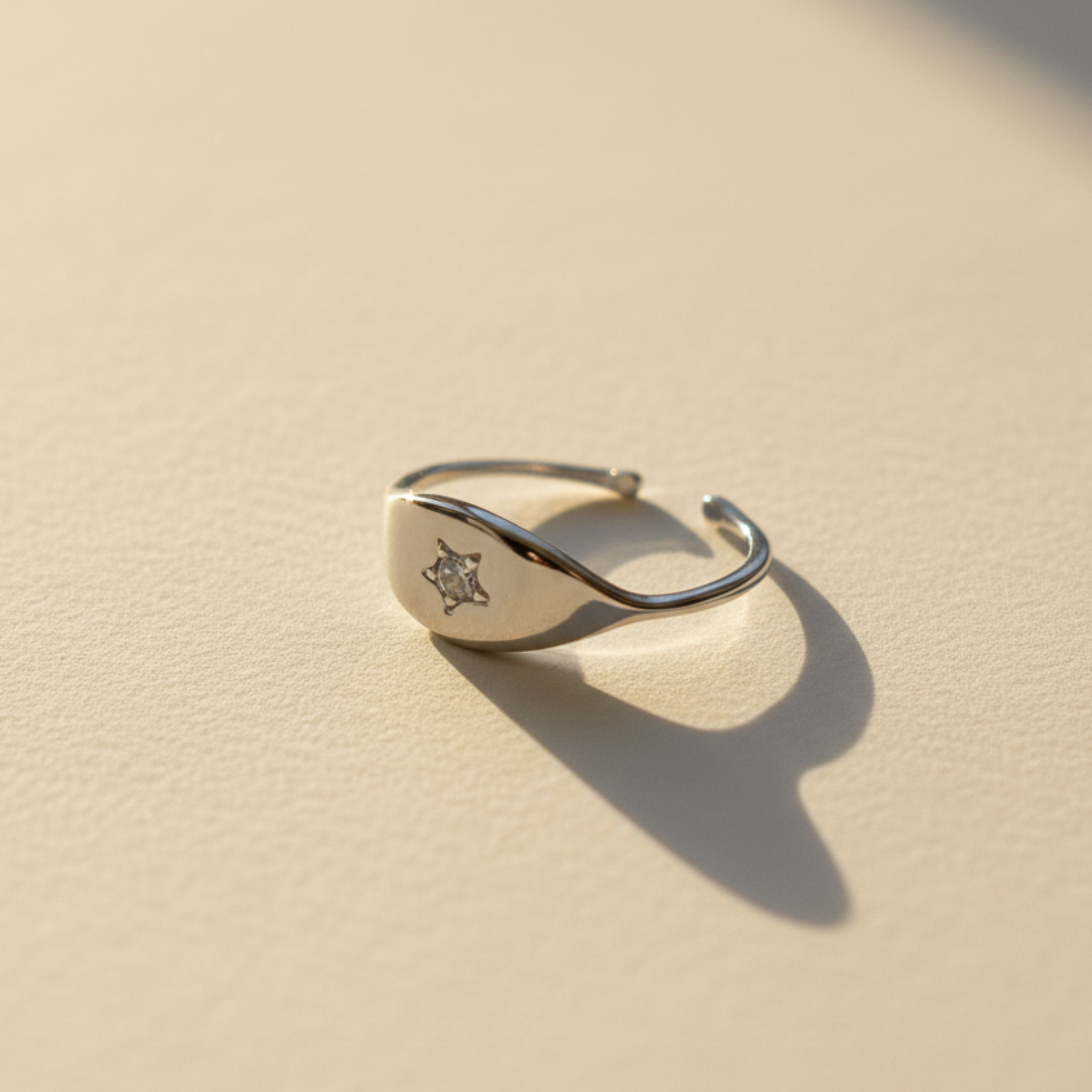 Desenvolvemos este anel em formato regulável justamente para aumentar o conforto e diminuir dúvidas na hora da escolha. Ele é aberto na parte inferior e feito de metal fino e maleável, permitindo que você ajuste facilmente ao tamanho perfeito para o seu dedo.