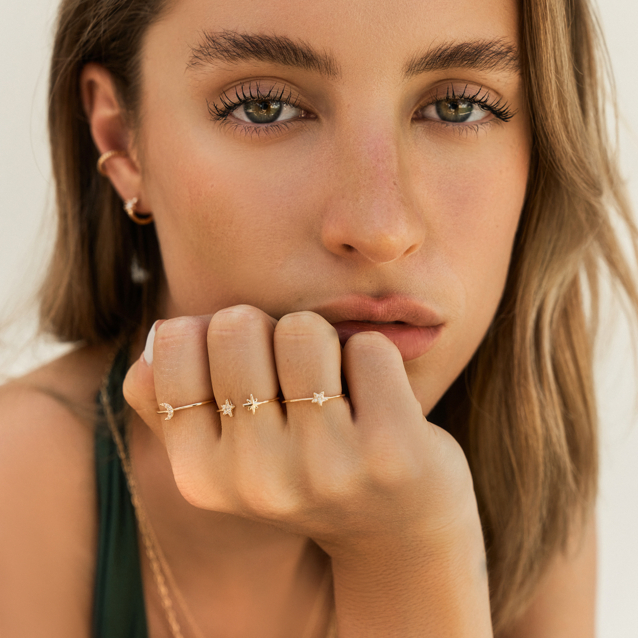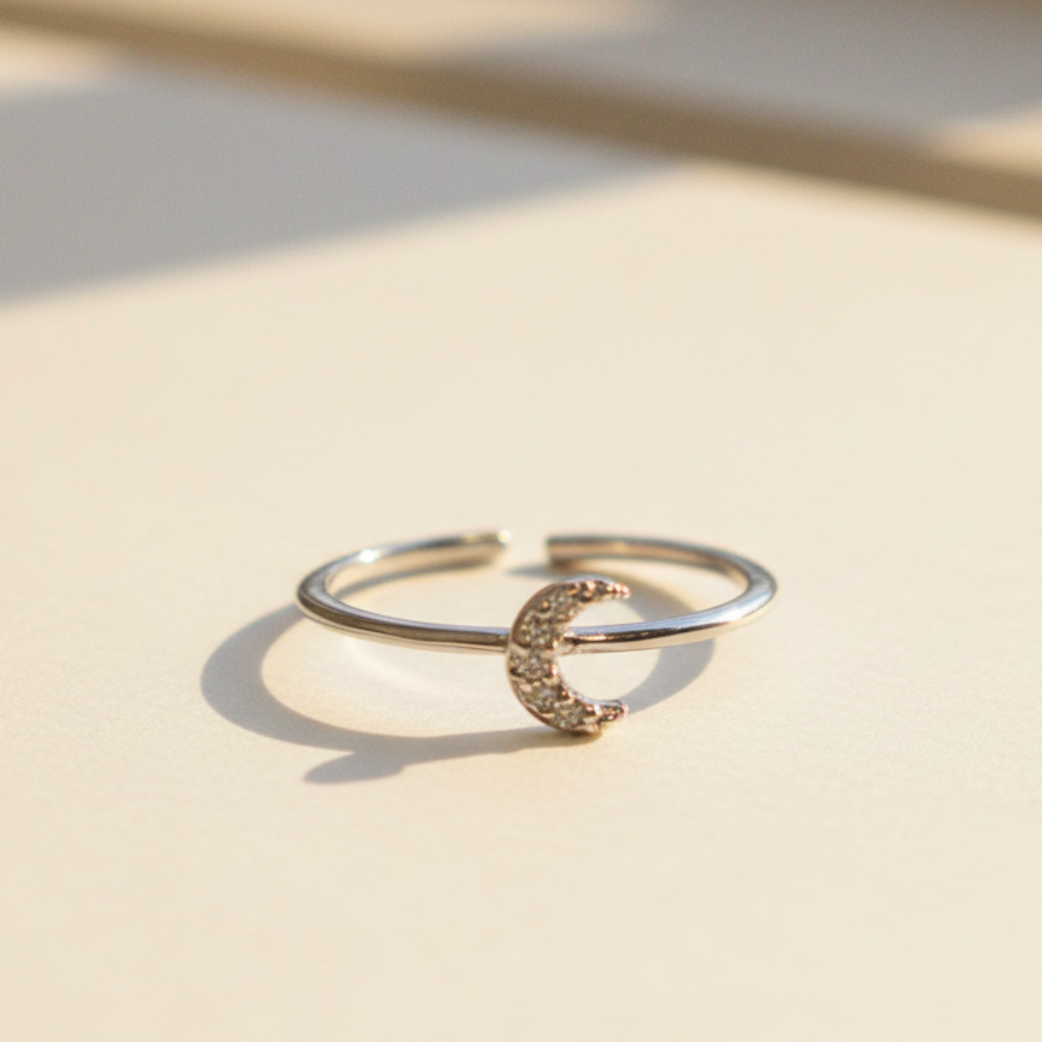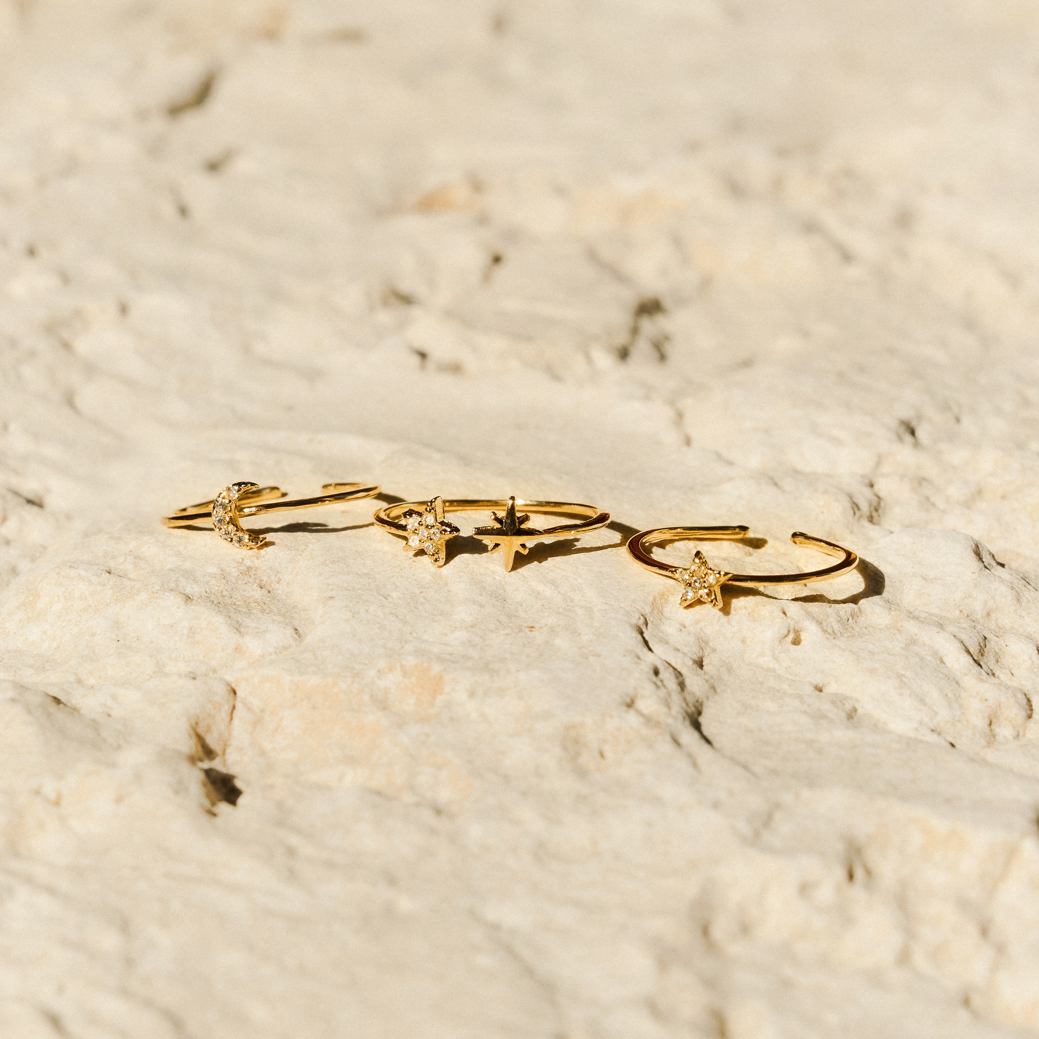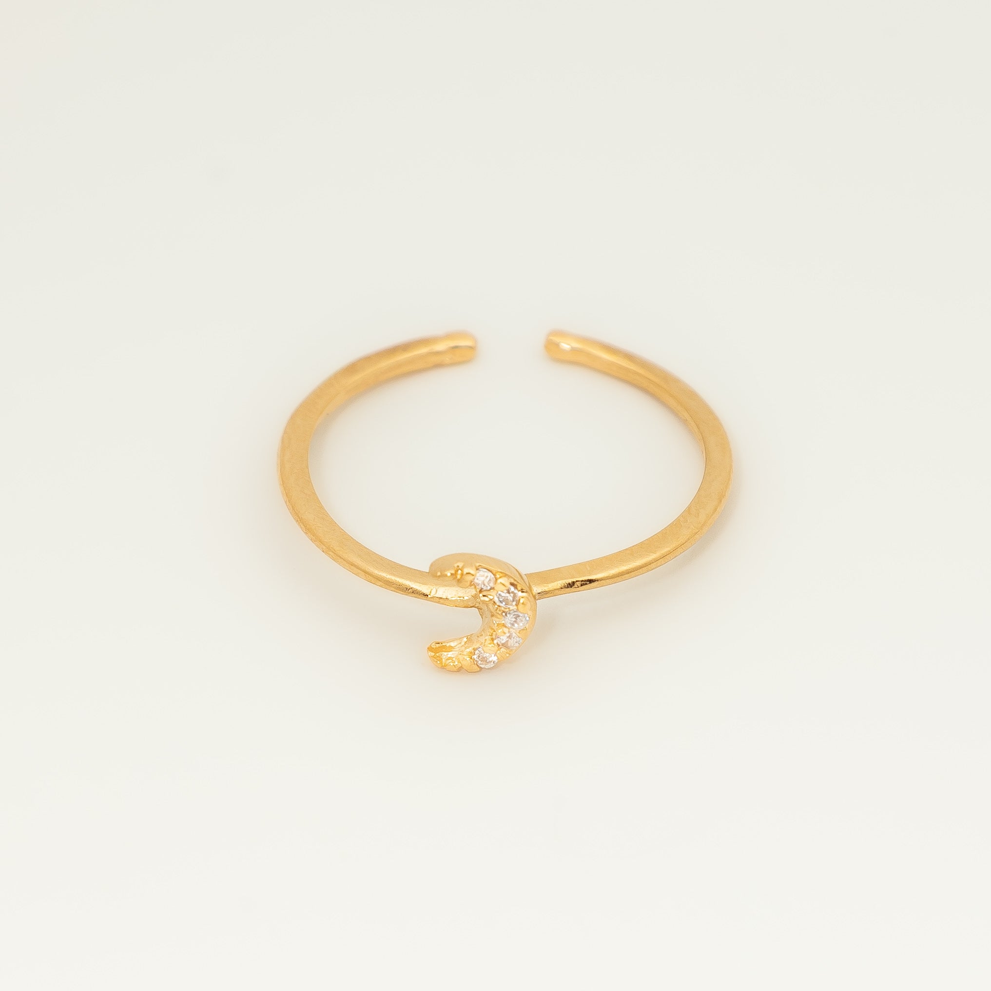 Moon é um anel banhado a ouro e regulável, com uma lua delicada no centro, esse anel é fininho, leve e cheio de charme.