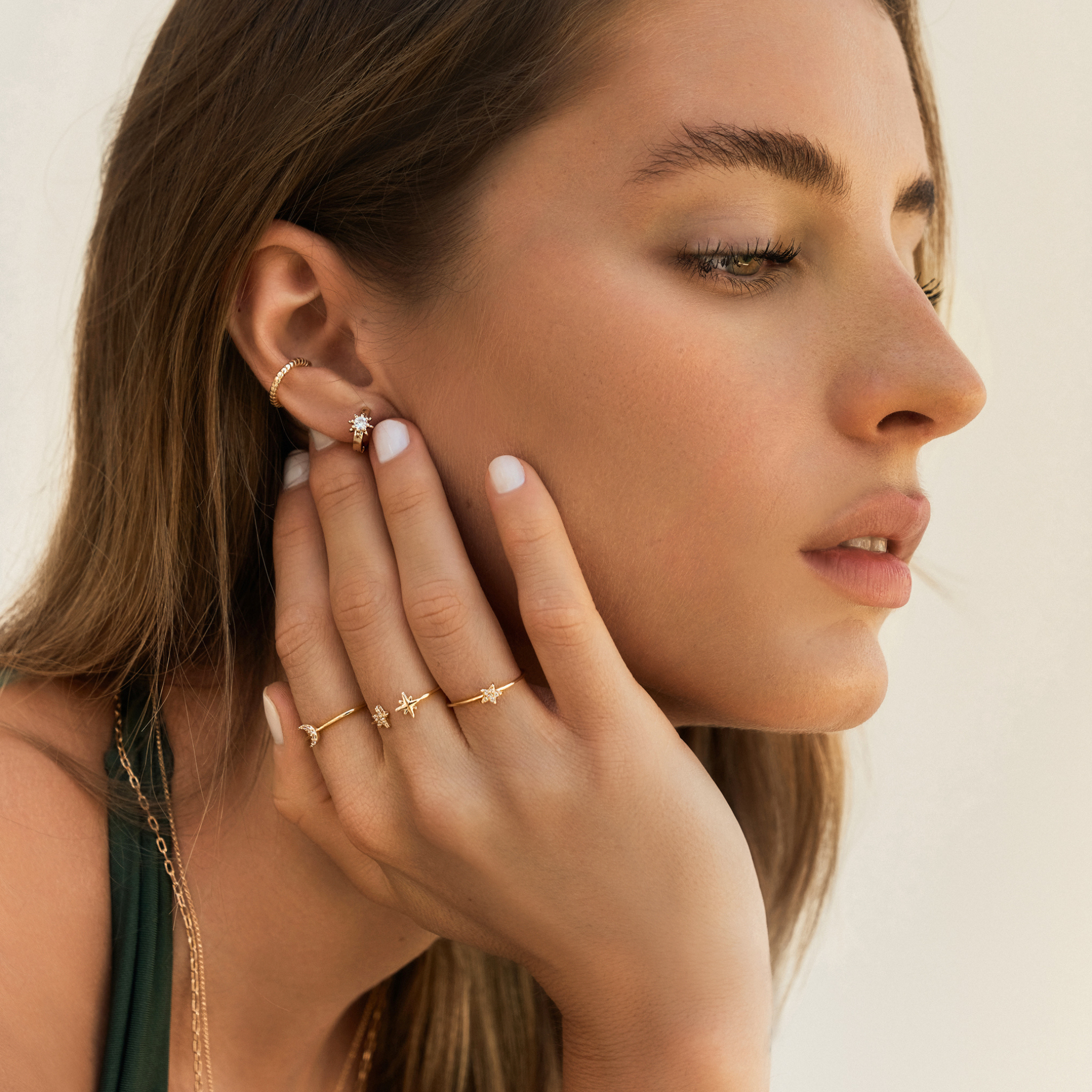 Desenvolvemos este anel em formato regulável justamente para aumentar o conforto e diminuir dúvidas na hora da escolha. Ele é aberto na parte inferior e feito de metal fino e maleável, permitindo que você ajuste facilmente ao tamanho perfeito para o seu dedo.