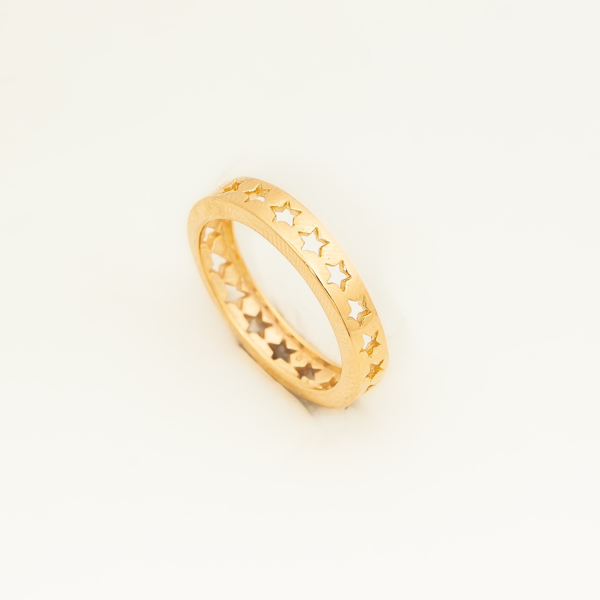 O Anel Zaya é banhado a ouro, um pouco mais grosso e marcante, com detalhe de pequenas estrelas feitas com corte a laser espalhadas pela superfície do anel — ele é daqueles que funcionam sozinho ou no mix.