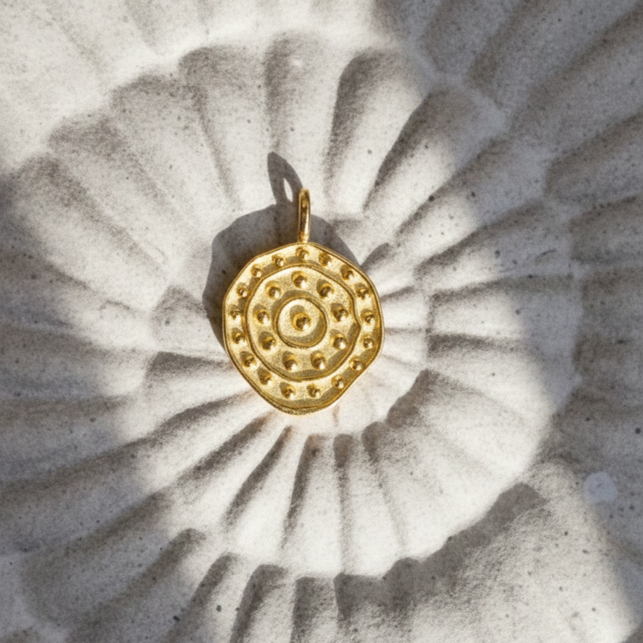 Uma medalha dourada com presença, que chama atenção do jeito certo. O Charm Fóssil Fosco é moderno e rico em detalhes, com bolinhas que adicionam textura e personalidade, é aquele ponto de presença no mix que transforma o colar, sem perder a elegância.