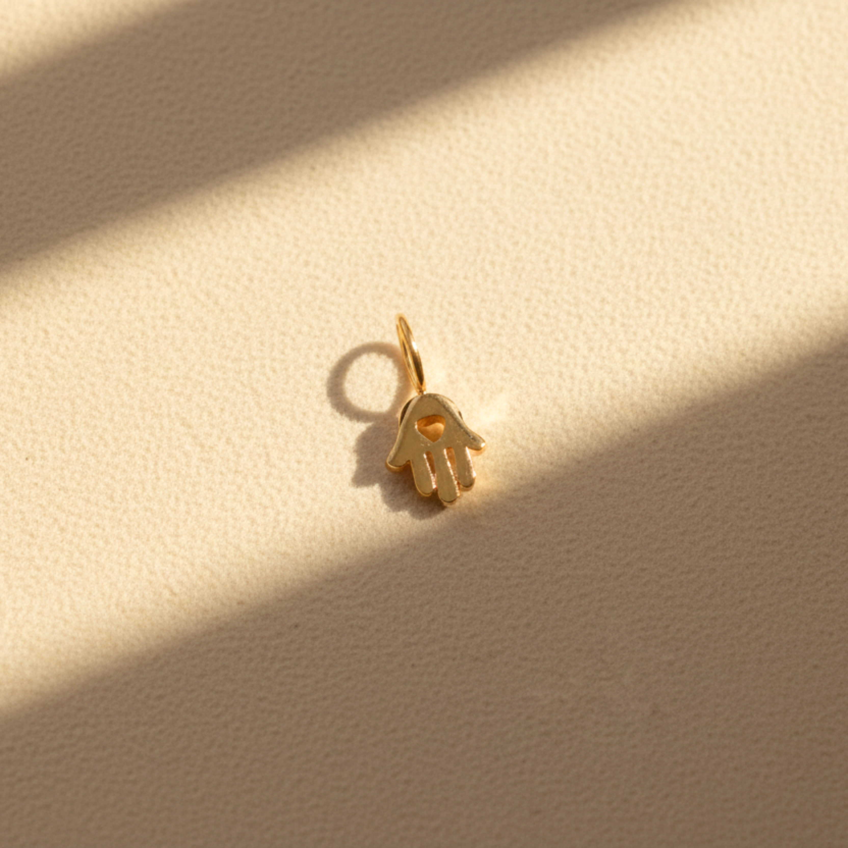 O Charm Hamsá é um pingente delicado banhado a ouro 18k, em formato da tradicional Mão de Fátima (ou Hamsá) com um pequeno coração no centro.