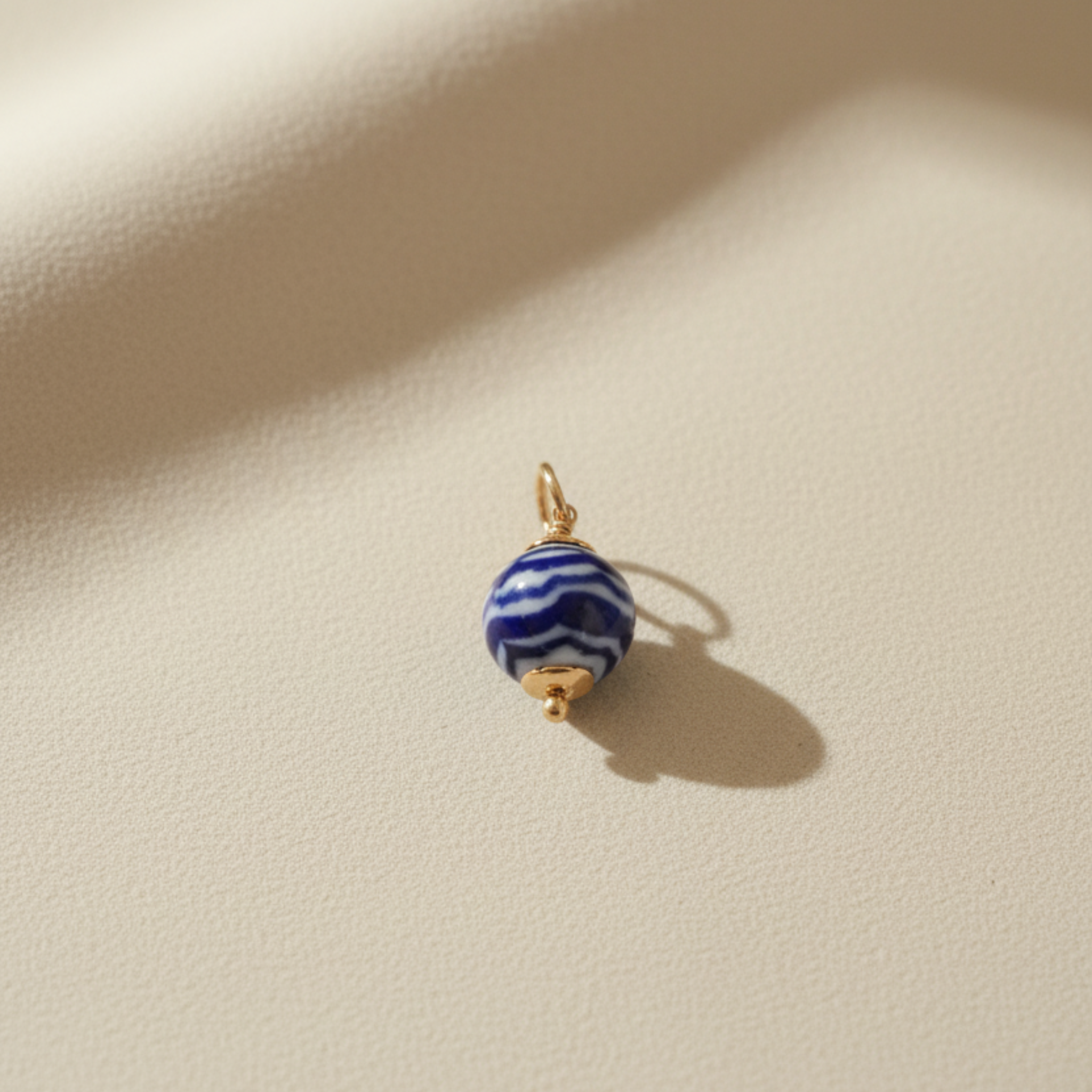 Fofo e super delicado, o Charm Maré é um pingente com acabamentos banhados a ouro 18k, 100% hipoalergênico, feito de porcelana em tons de azul e branco que lembram as ondas do mar. Ele traz um equilíbrio de cor e frescor para o seu mix, deixando qualquer combinação mais leve e divertida.