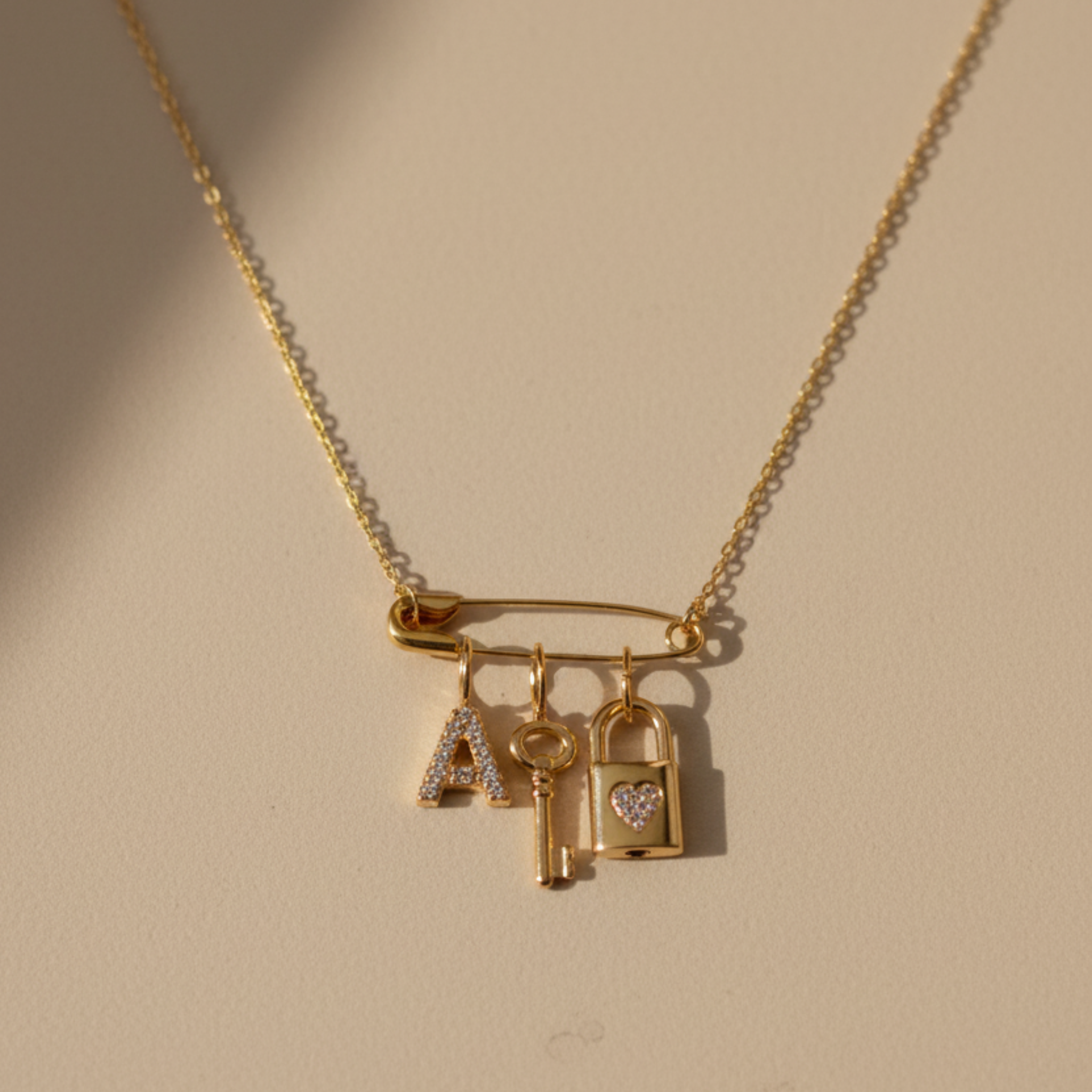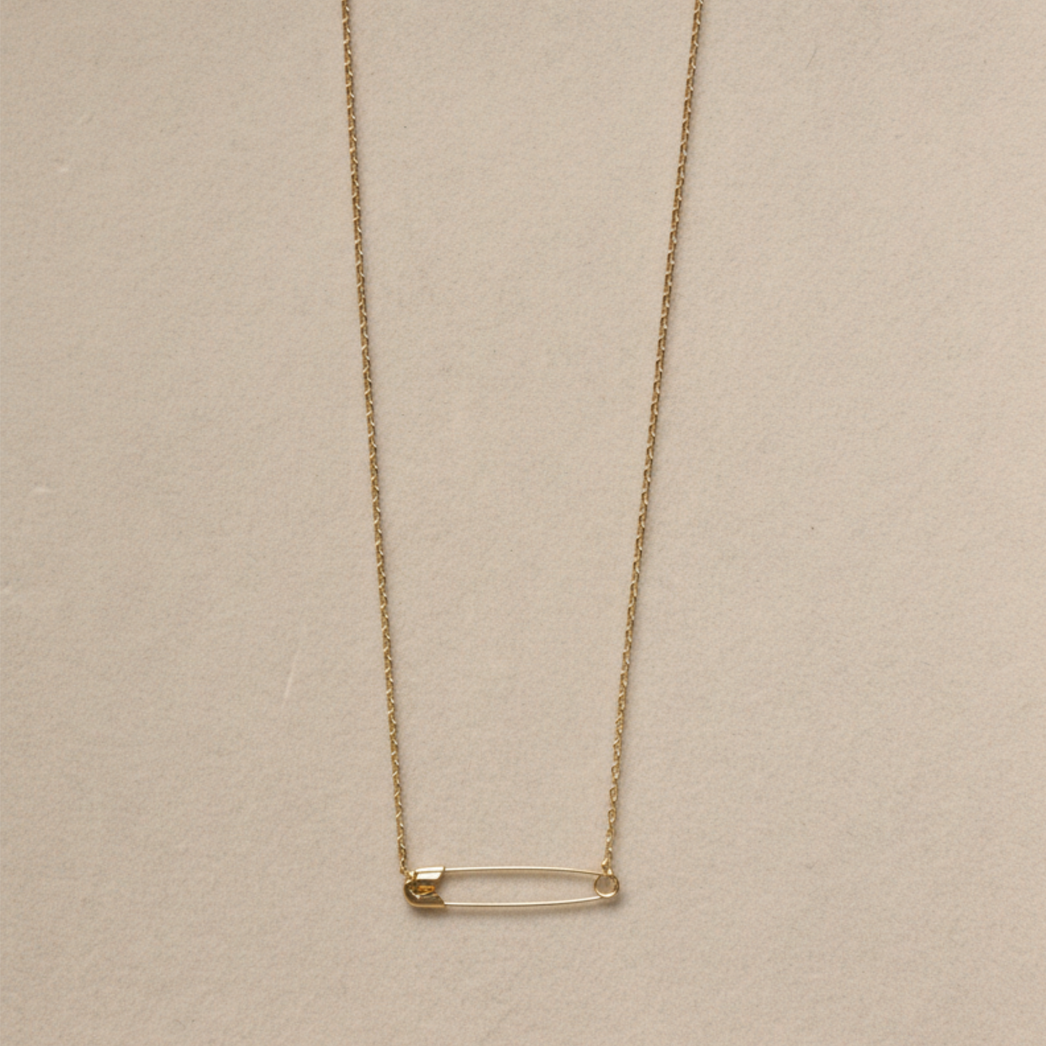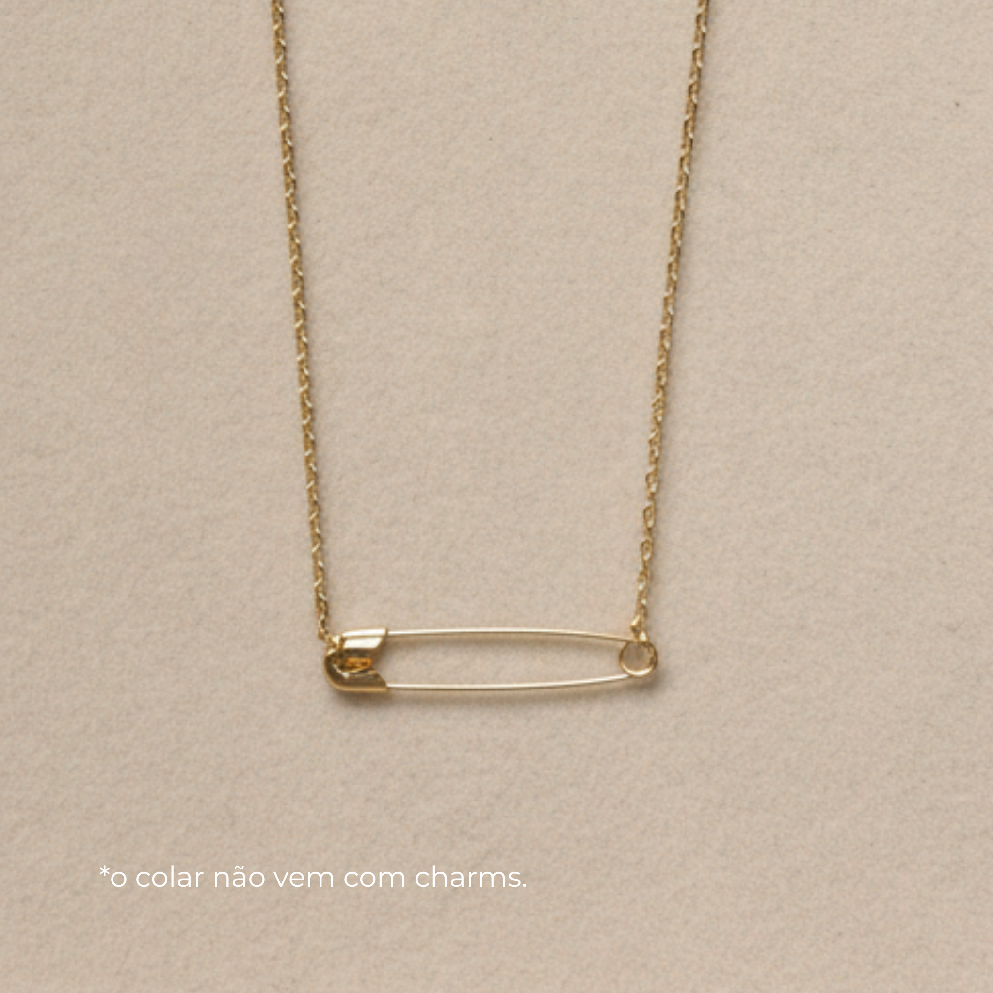 Com design em formato de alfinete, o colar é banhado a ouro 18k, delicado e versátil. O fecho abre e fecha com praticidade, permitindo que você adicione diferentes charms e personalize a peça de acordo com seu estilo.