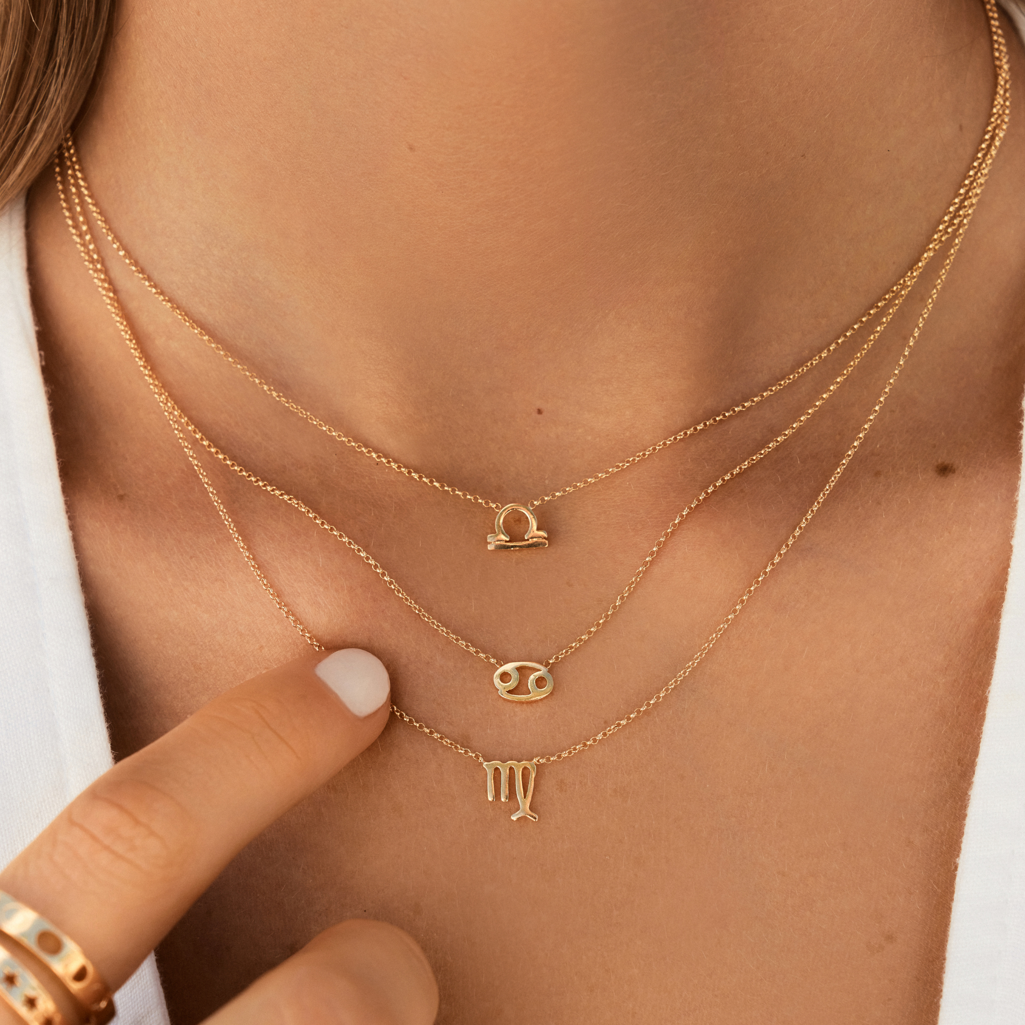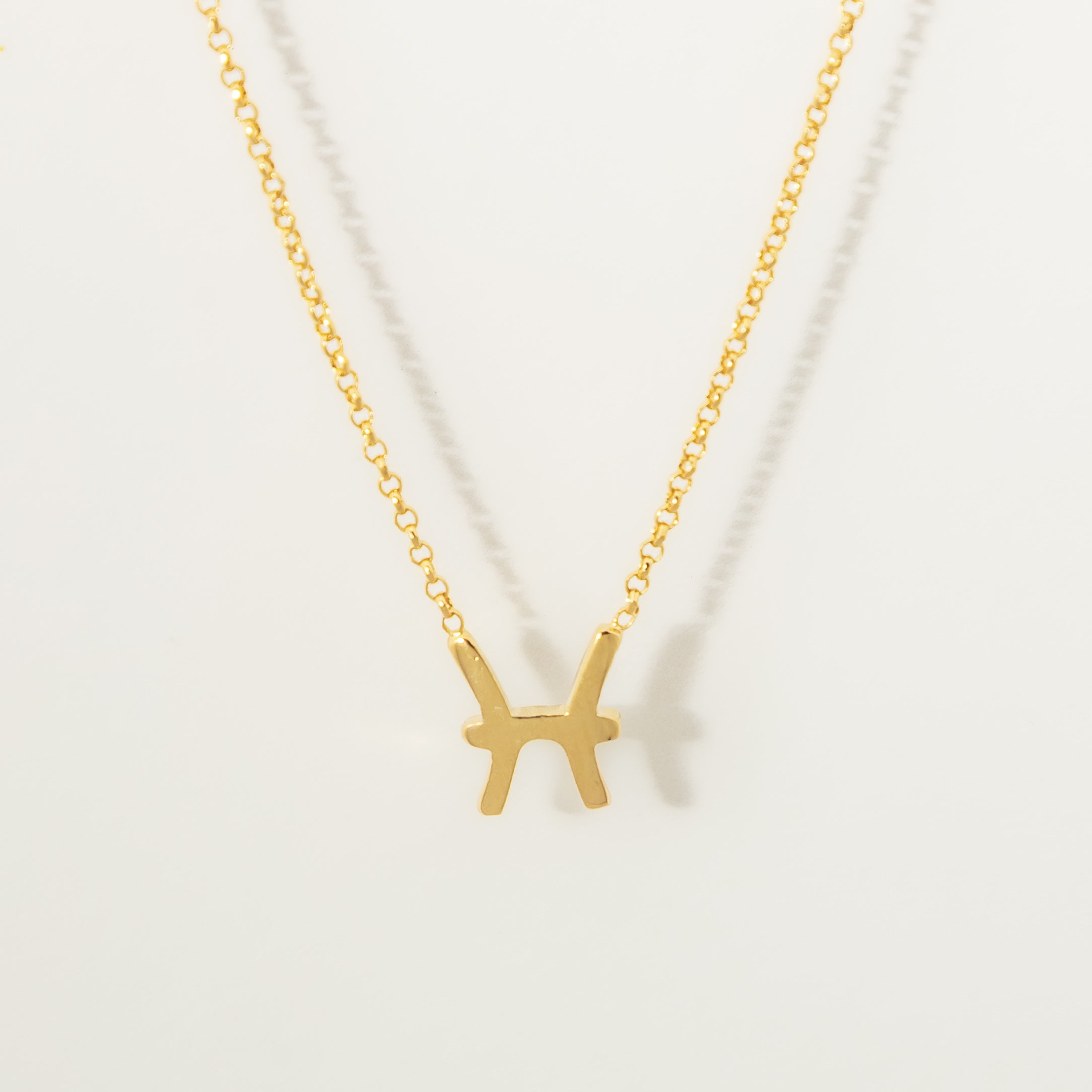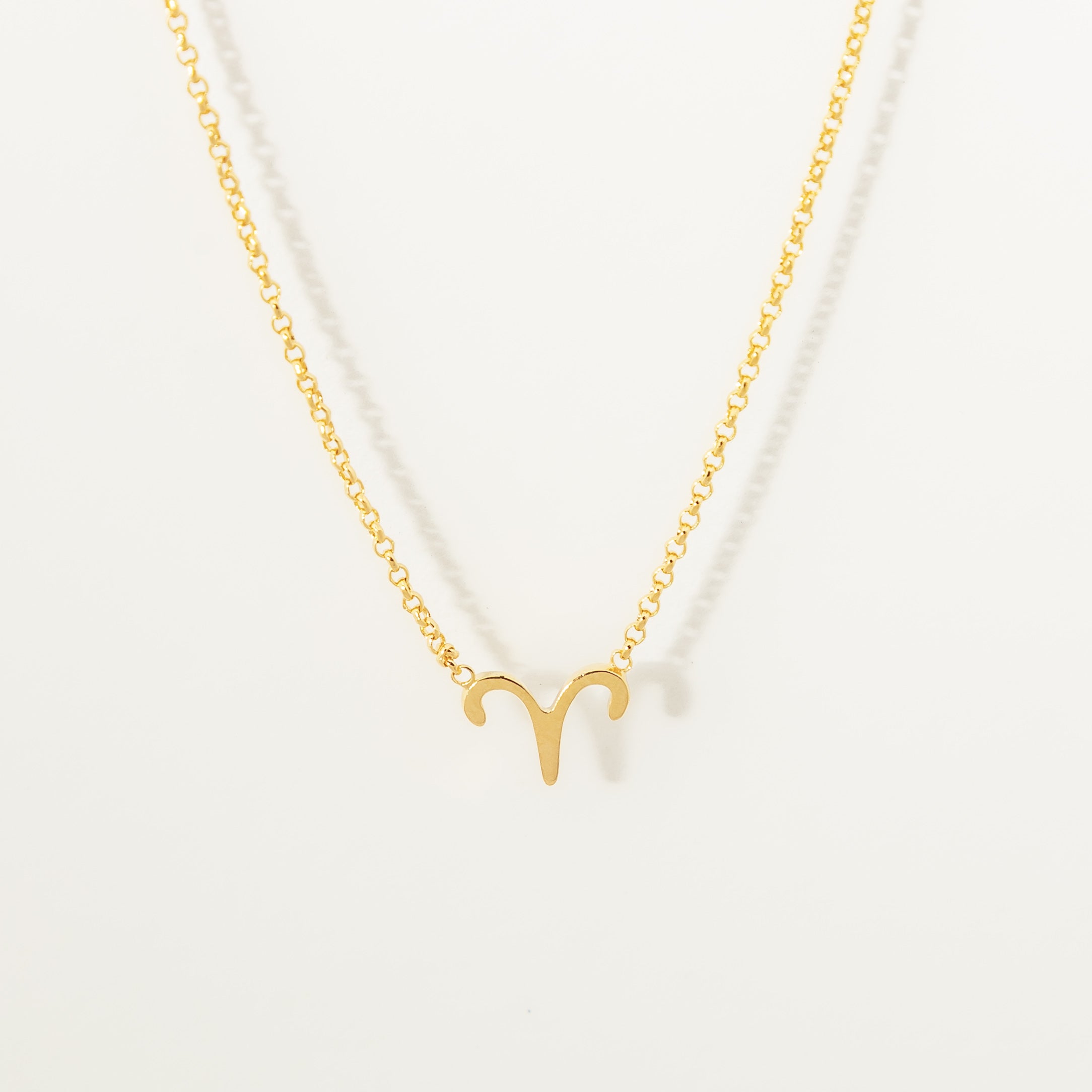 O Cosmic é um colar feminino curto e banhado a ouro, com um pingente delicado com o símbolo de seu signo — você pode usar sozinho ou combinar com outros colares pra criar um mix.