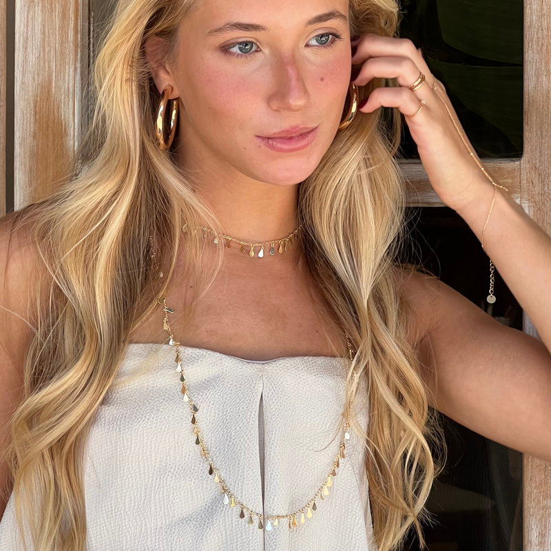 nosso queridinho best seller: colar curto com pingentes de mini gotinhas distribuídos ao longo da corrente banhada a ouro 18k com película de proteção contra alergias.