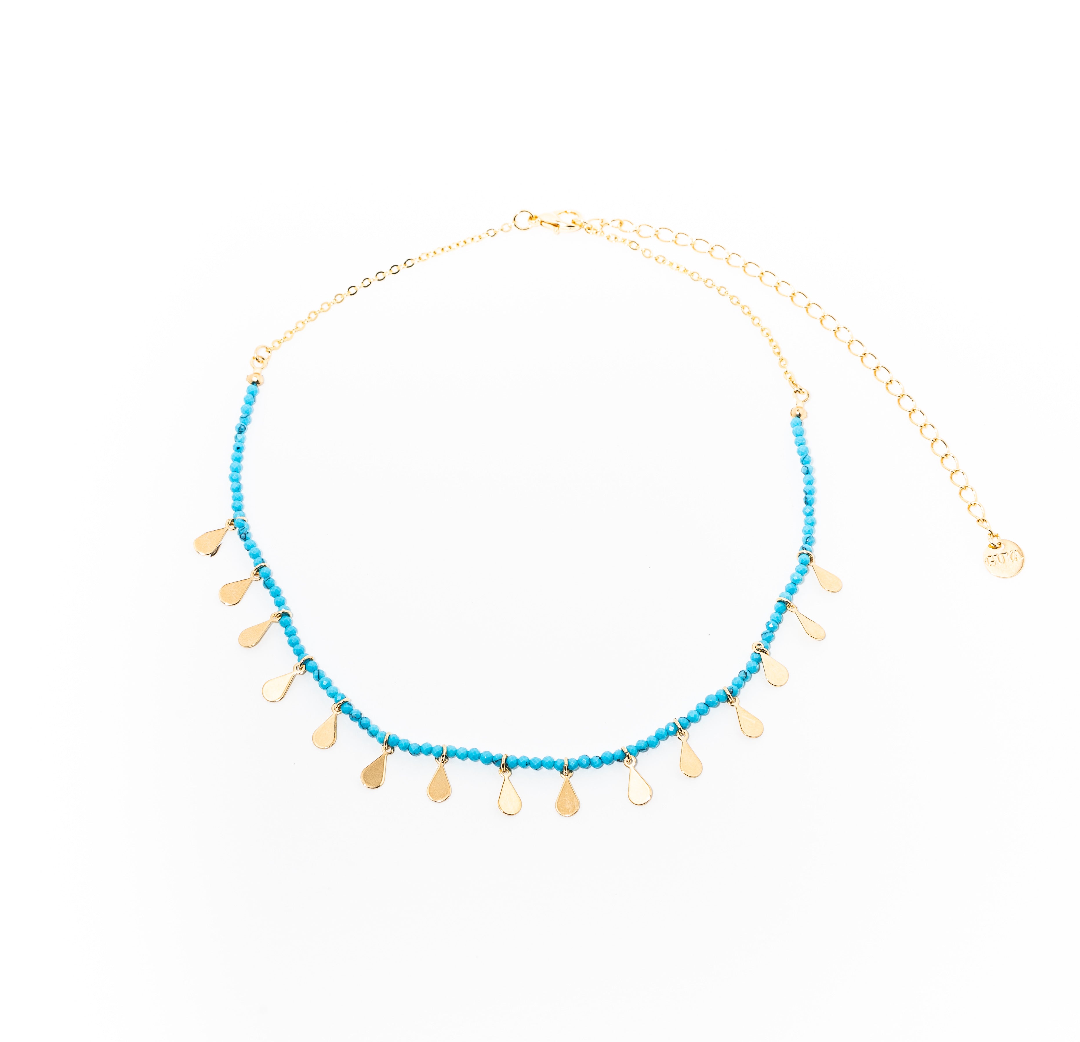 colar feito de pedra de howlita turquesa com 15 pingentes de metal em formato de gotas banhados a ouro 18k.