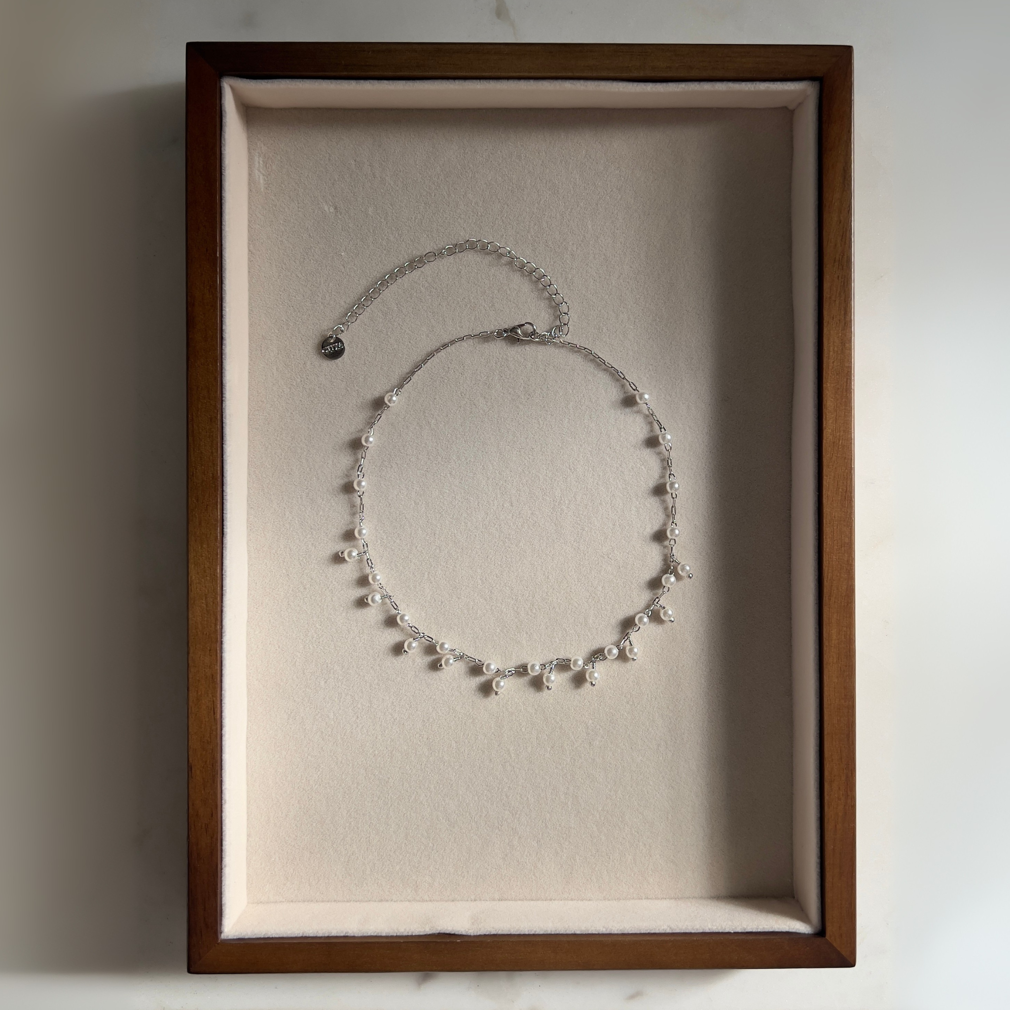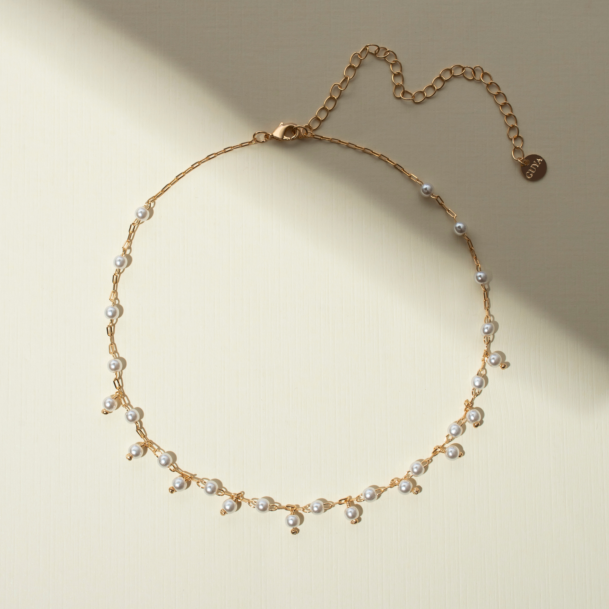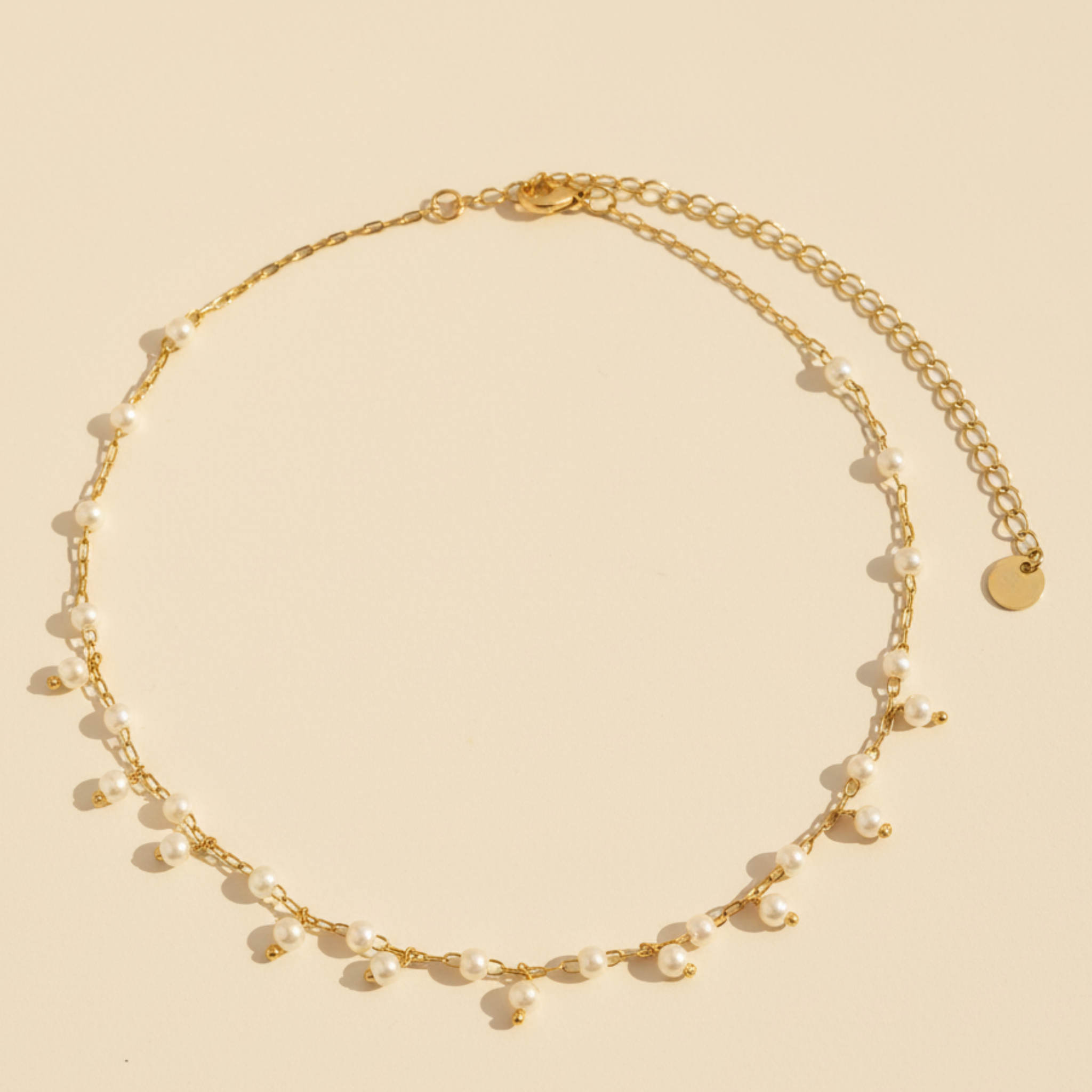 colar curto com entremeios de mini pérolas sintéticas ao redor da corrente banhada a ouro 18k com película de proteção contra alergias.