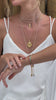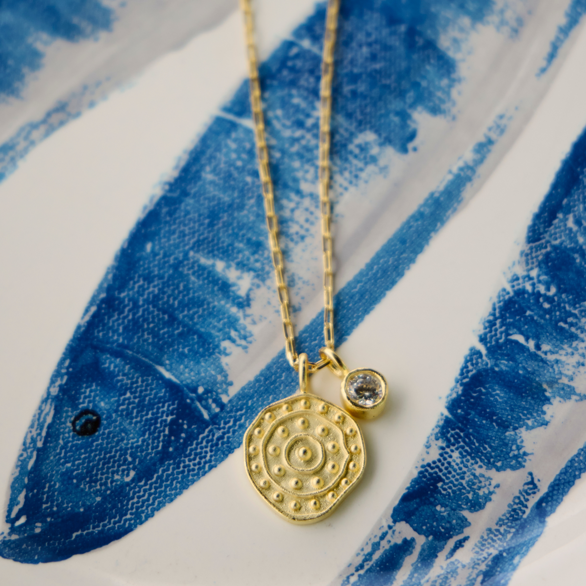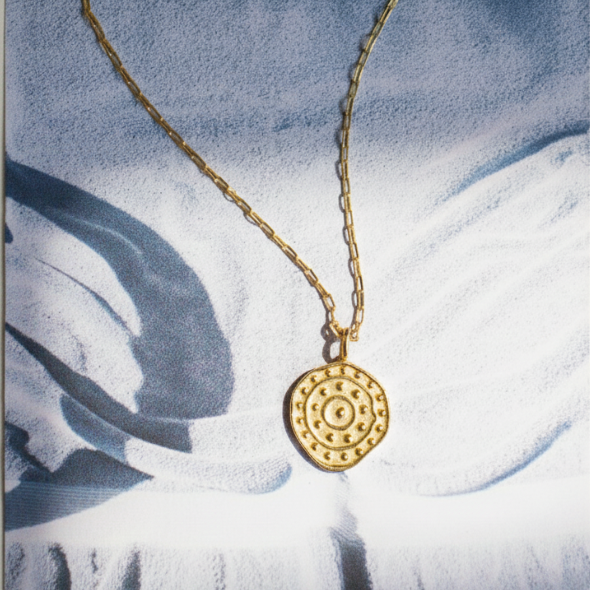 O Colar Trancoso traz uma corrente de elos delicada com um pingente de medalha assimétrico que nos remete um fóssil marinho. Com um tamanho maior do que nossos pingentes clássicos, ele traz muita presença: o banho fosco da medalha traz um charme moderno, a textura e a riqueza de detalhes fazem dele perfeito para elevar qualquer look com um toque sofisticado. Ótimo para misturar com os colares de pedra coloridos.