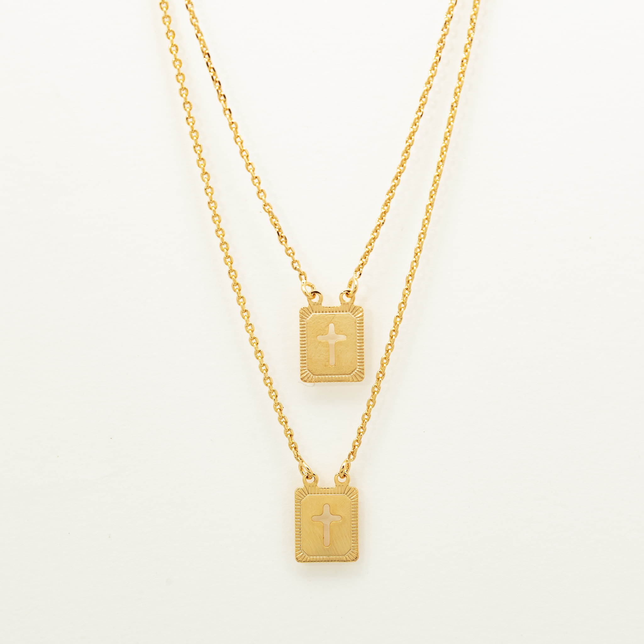 Este escapulário traz duas cruzes vazadas no centro e uma borda detalhada ao redor das medalhas. Uma peça unissex com significado que também funciona como um acessório versátil e moderno.