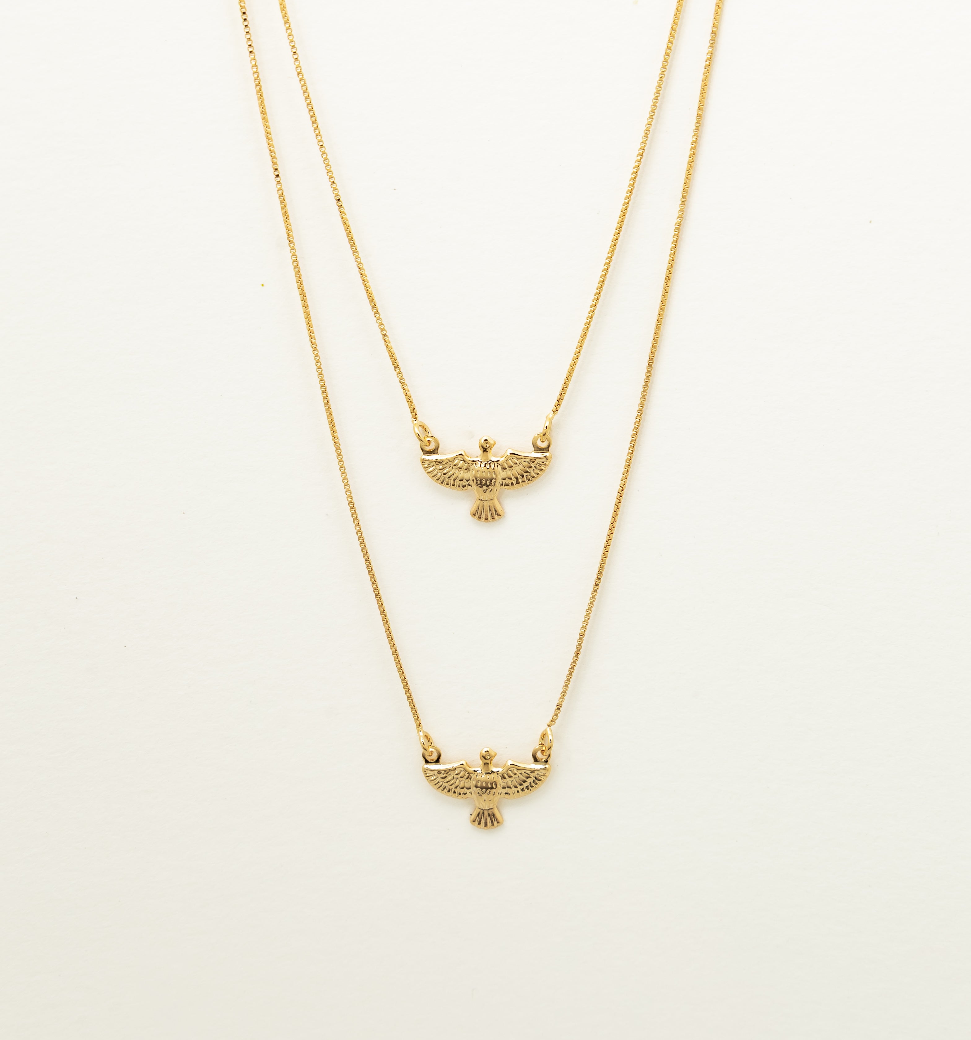 Escapulário banhado a ouro 18k com duas pombinhas - símbolo do Espírito Santo, que representa fé, proteção e paz. Um acessório sutil e delicado.