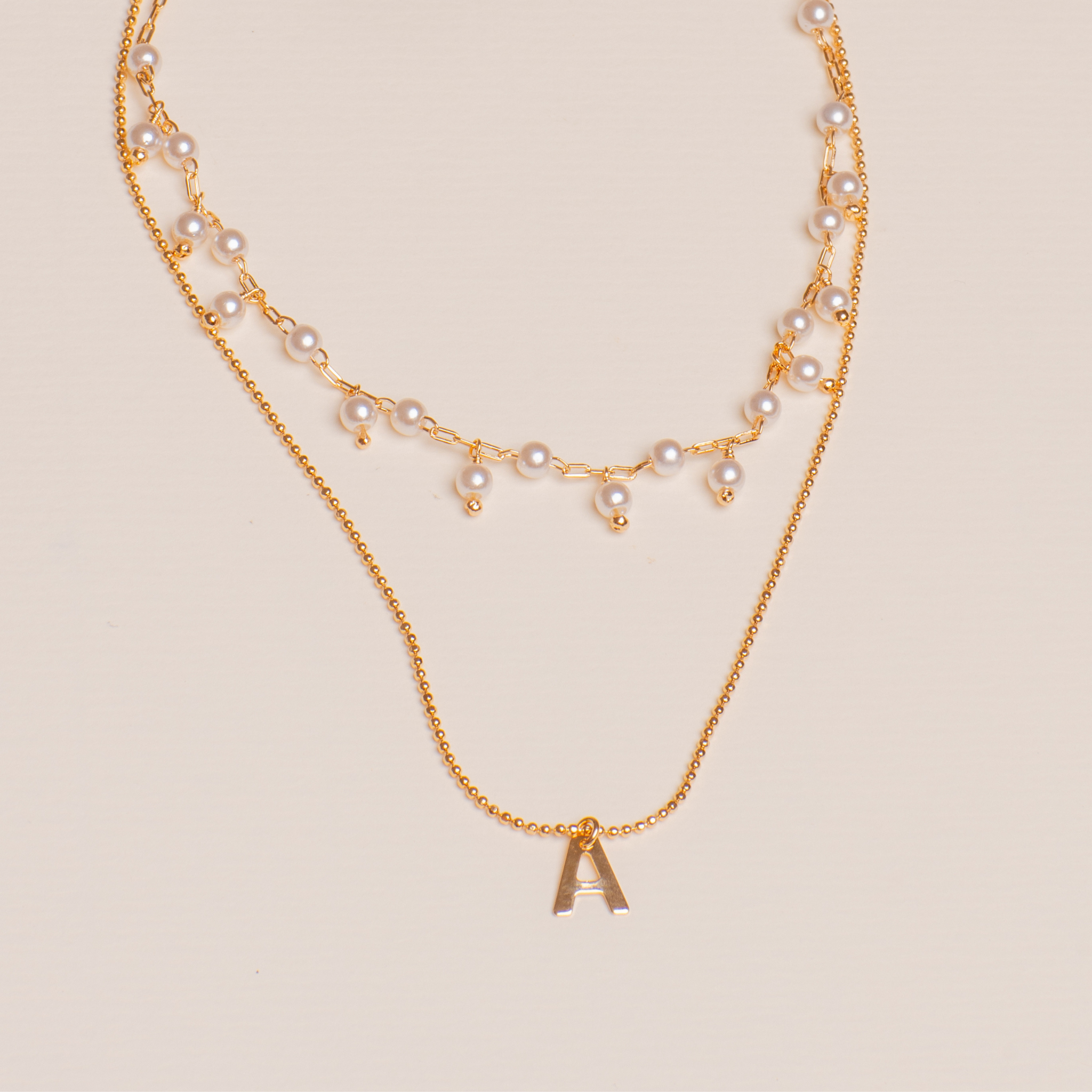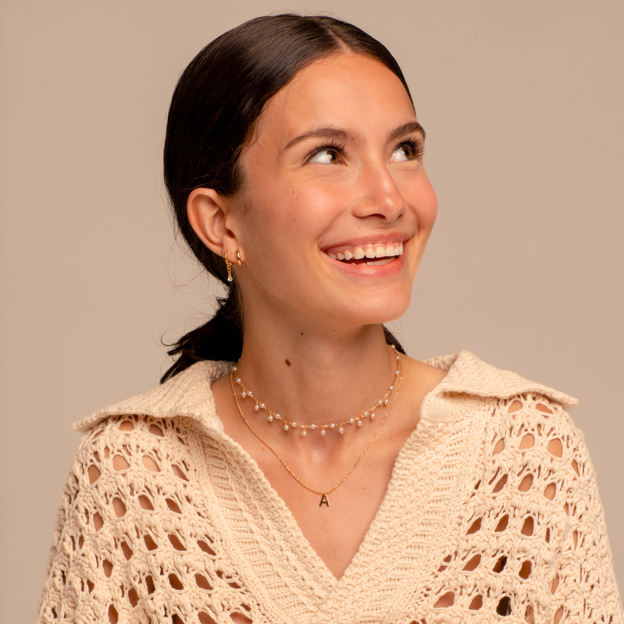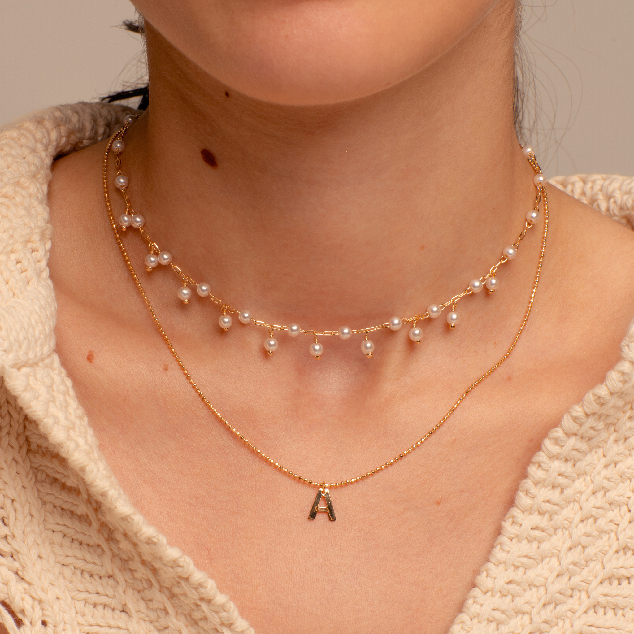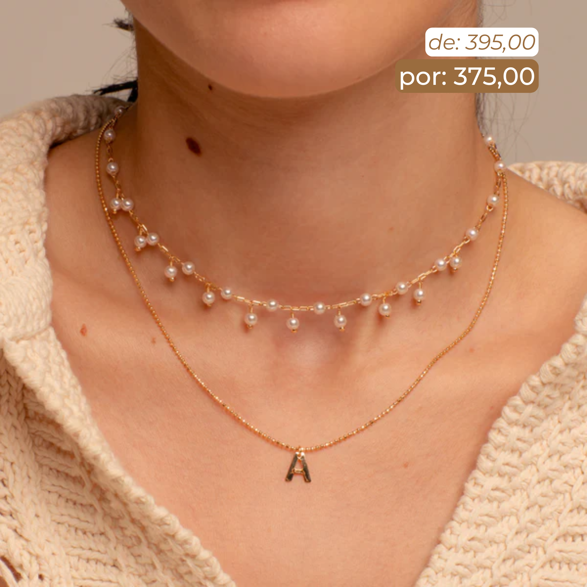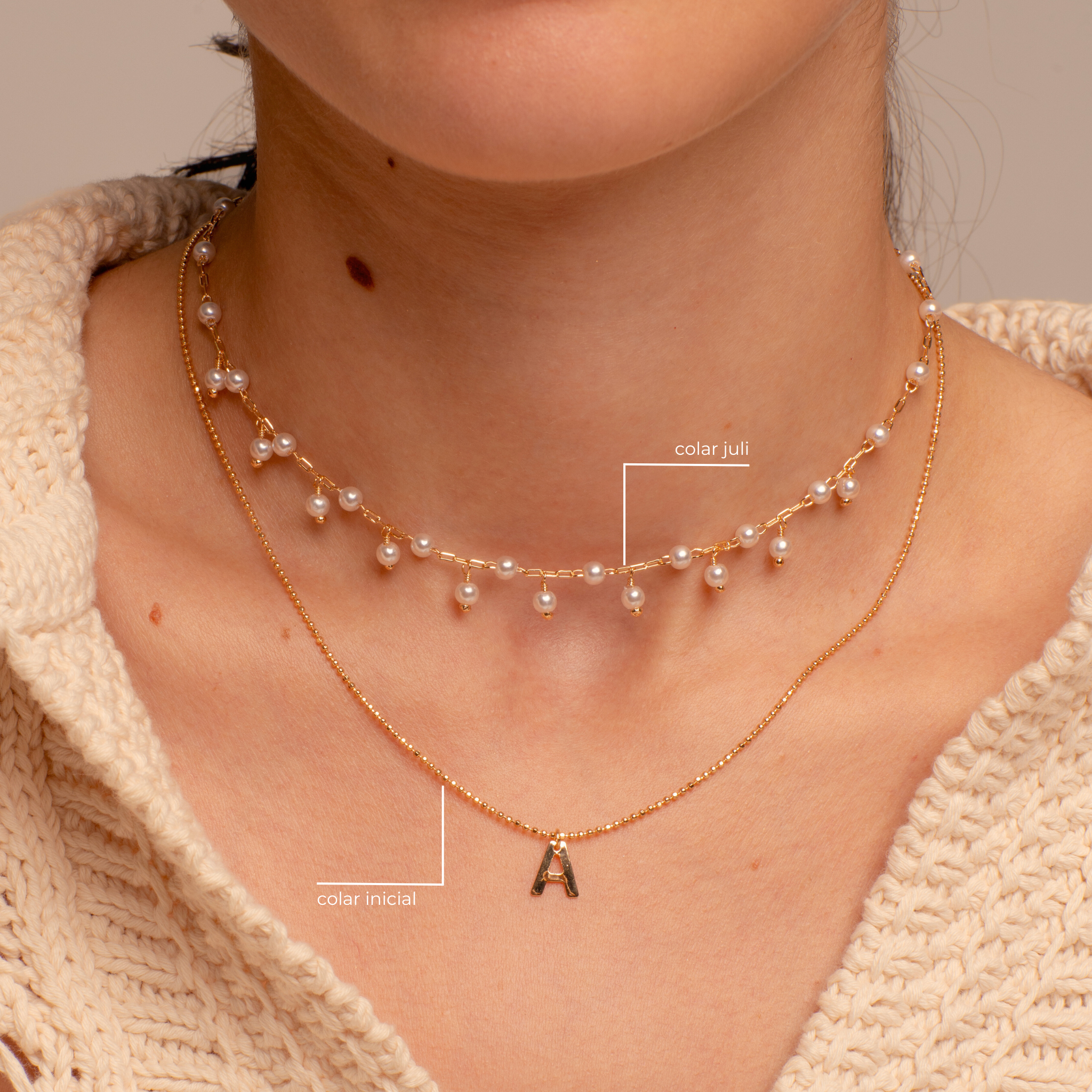 O Colar Juli é mais curto, com entremeios de mini pérolas sintéticas ao redor da corrente. Também possui extensor de tamanho.