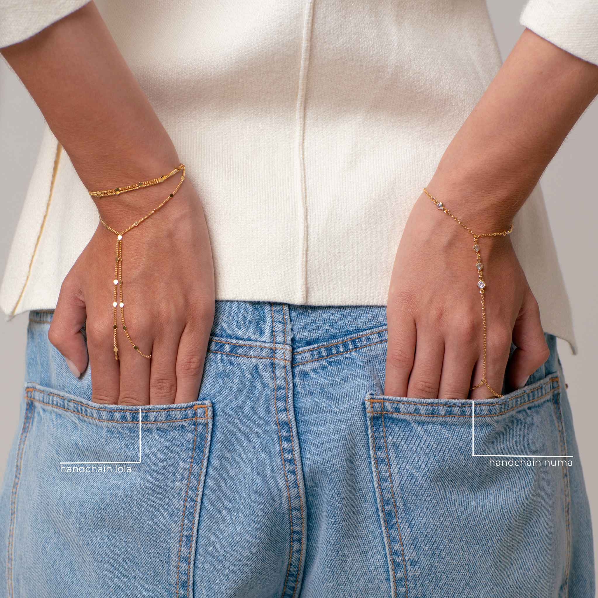 A Handchain Numa é uma mistura de pulseira com anel de corrente. Ela é feita com uma corrente fina e delicada, com 3 pontos de luz de zircônia na corrente que liga a pulseira ao anel e 2 pontos de luz na base da pulseira. Possui extensor de tamanho.