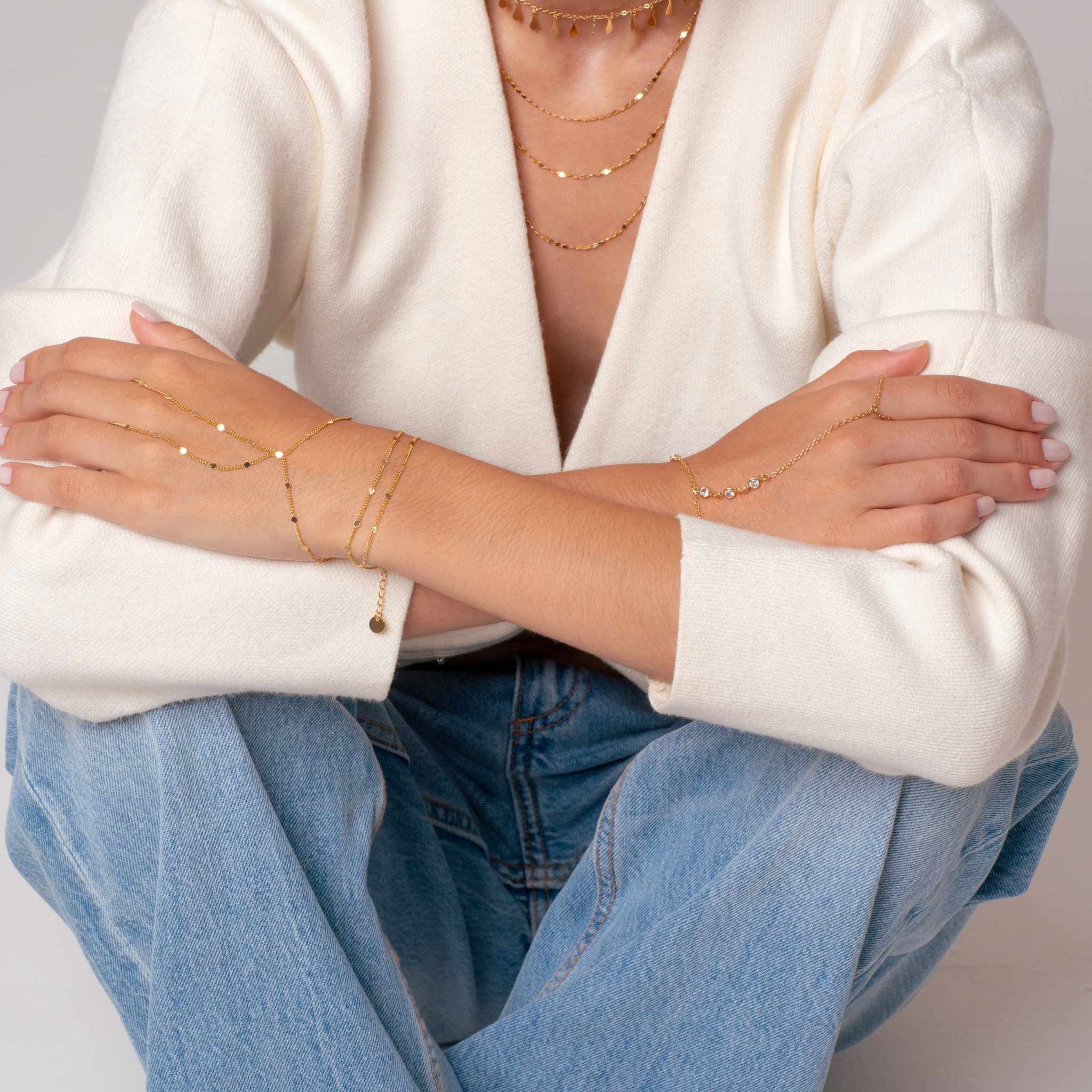 A Handchain Lola é uma mistura de pulseira de 3 voltas com anel de corrente. Ela é feita com uma corrente fina e delicada, com pontos de luz que ligam a pulseira ao "anel". Possui extensor de tamanho.