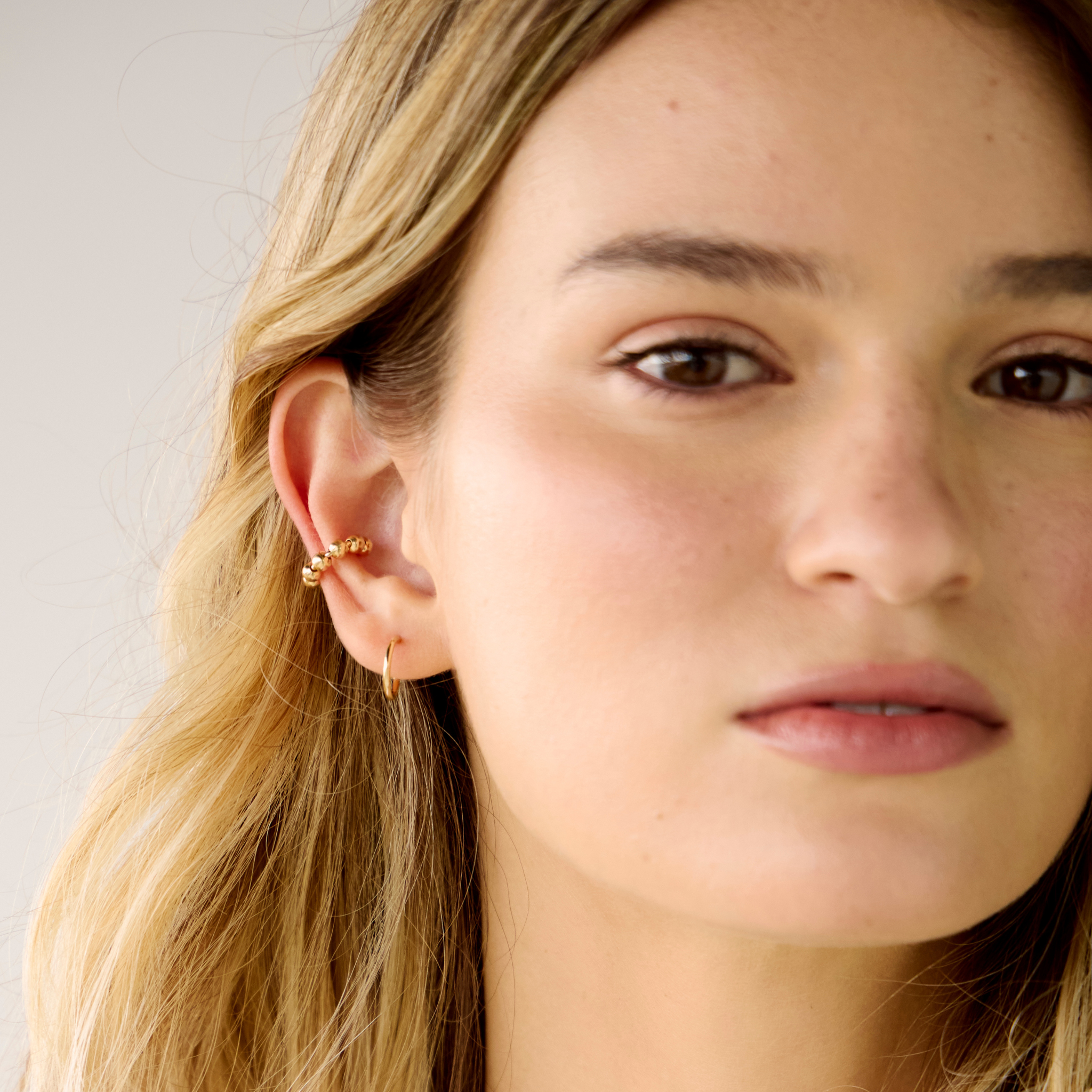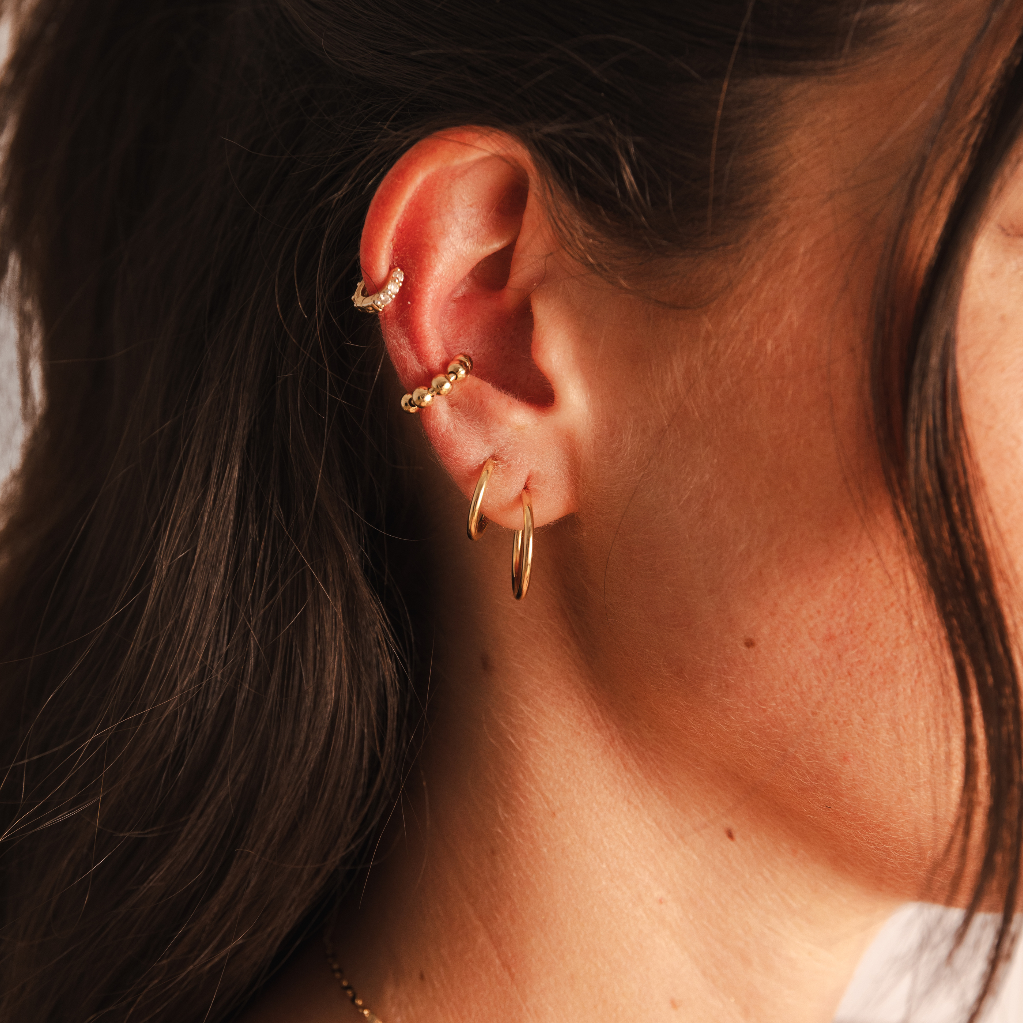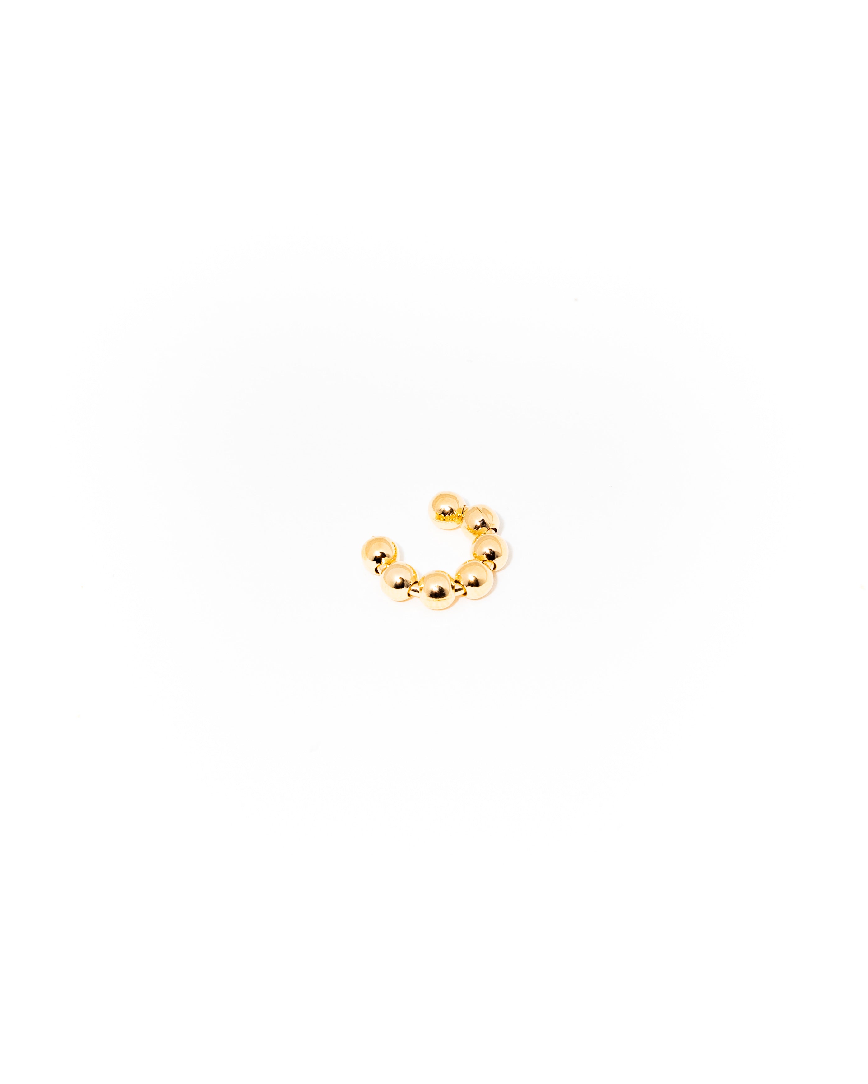 Este piercing fake de pressão traz um design delicado com bolinhas banhadas a ouro 18k, adicionando um toque de charme e modernidade ao seu look.