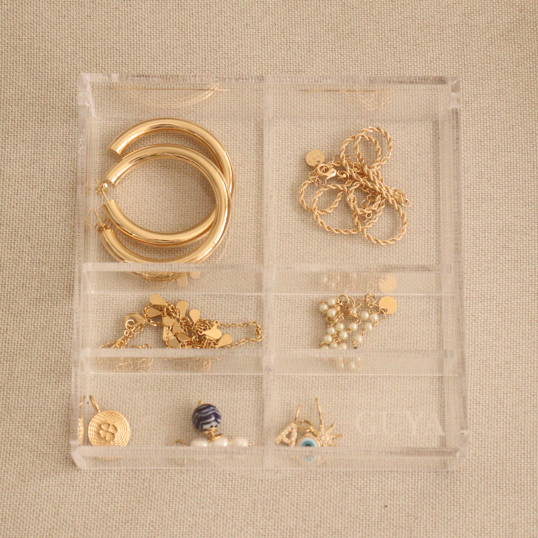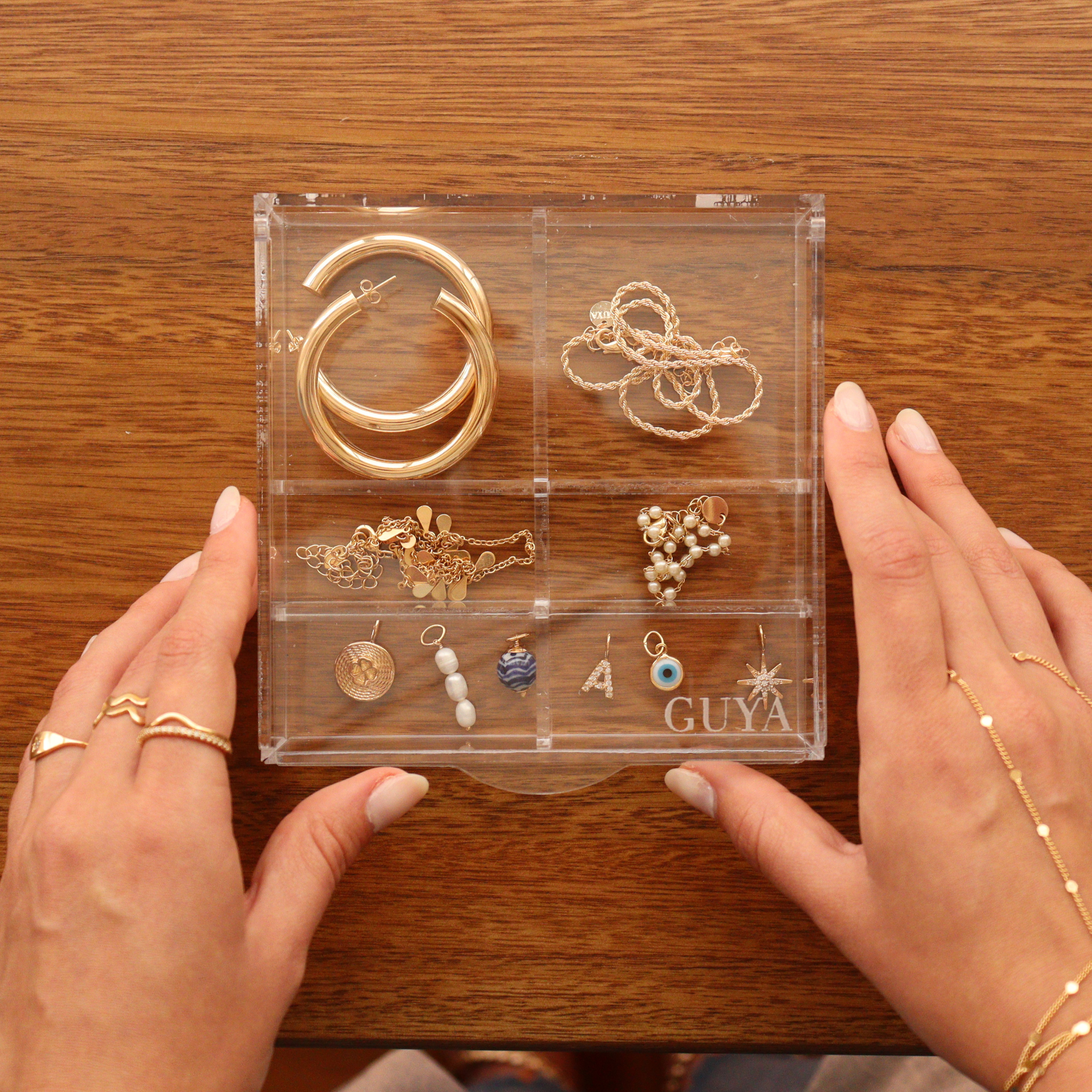 Com 13x13cm e 4cm de altura, ele é feito em acrílico transparente de alta qualidade e 3mm de espessura. Super leve e ao mesmo tempo, resistente. A tampa articulada tem abertura suave e traz a logo GUYA gravada a laser no canto inferior direito. Por dentro, são 2 compartimentos maiores (6x6cm) perfeitos para seus colares e acessórios maiores (suas Argolas Manu 4 cabem confortavelmente aqui!), além de 4 compartimentos menores (3x6cm) ideais para organizar seus anéis, brincos, pulseiras e charms.