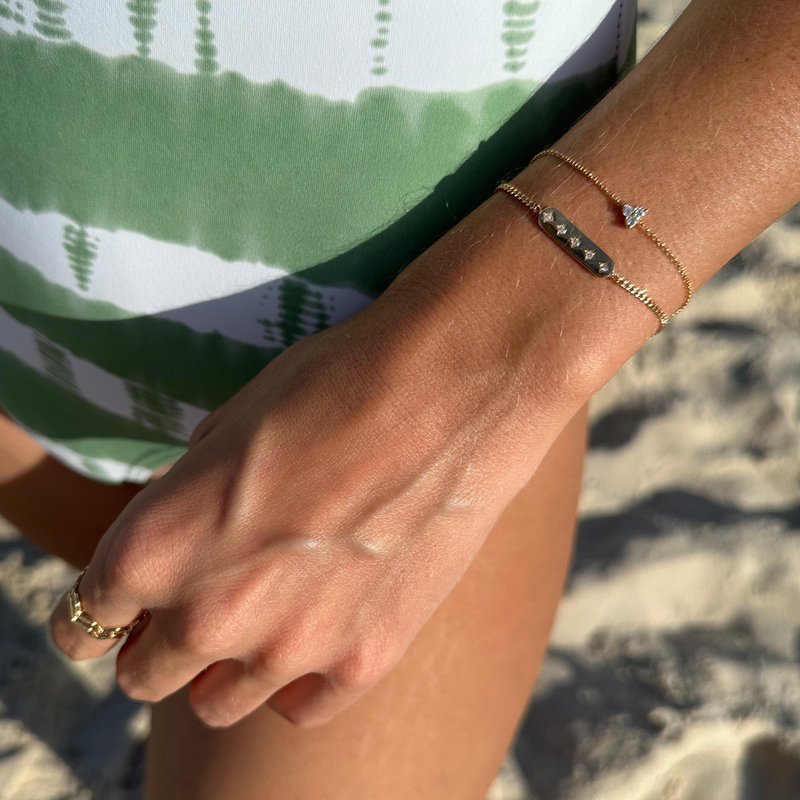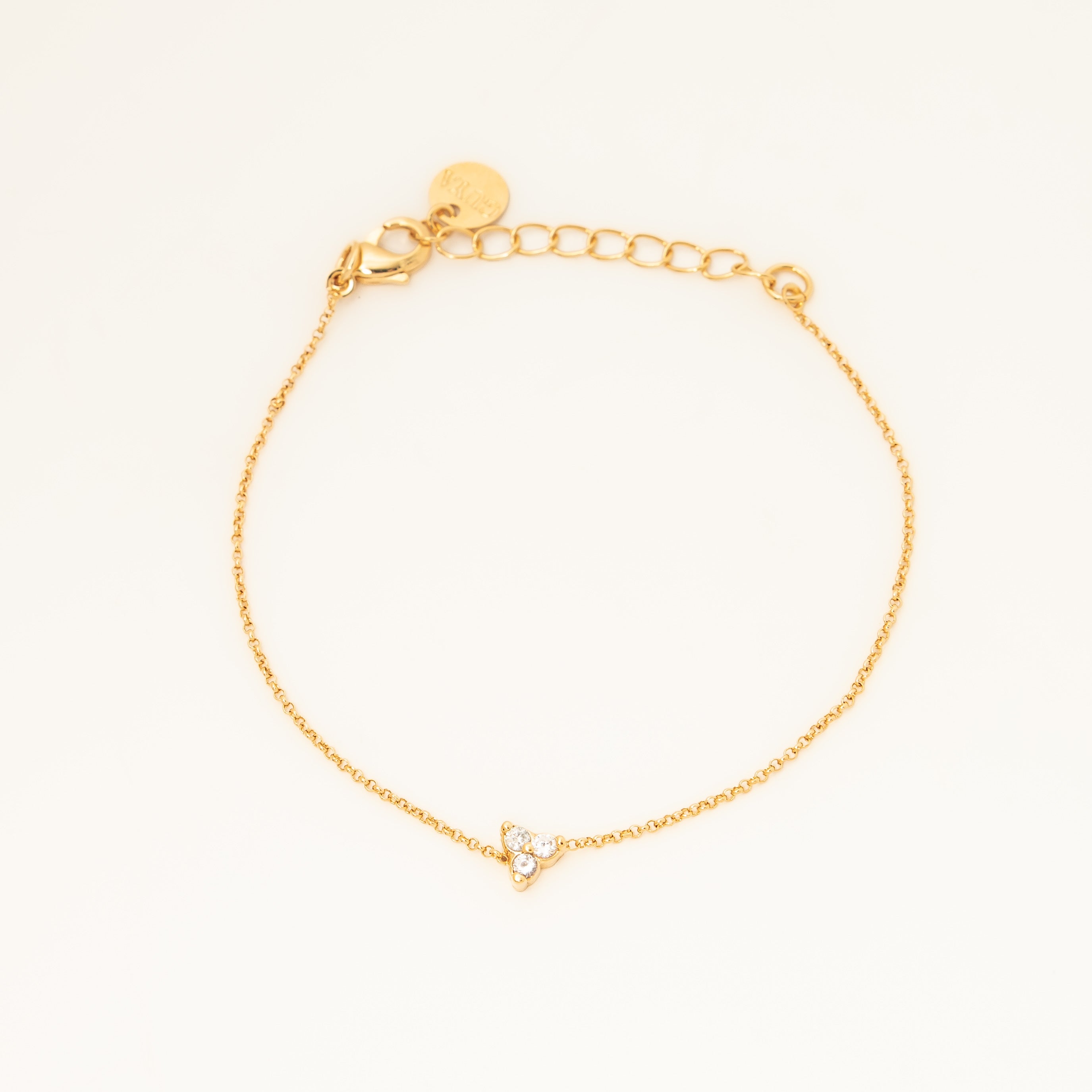 Trinity é uma pulseira feminina, fina, delicada e banhada a ouro, com três pequenas pedras de zircônia que criam um brilho sutil no pulso. Leve, confortável e perfeita pra usar todos os dias.