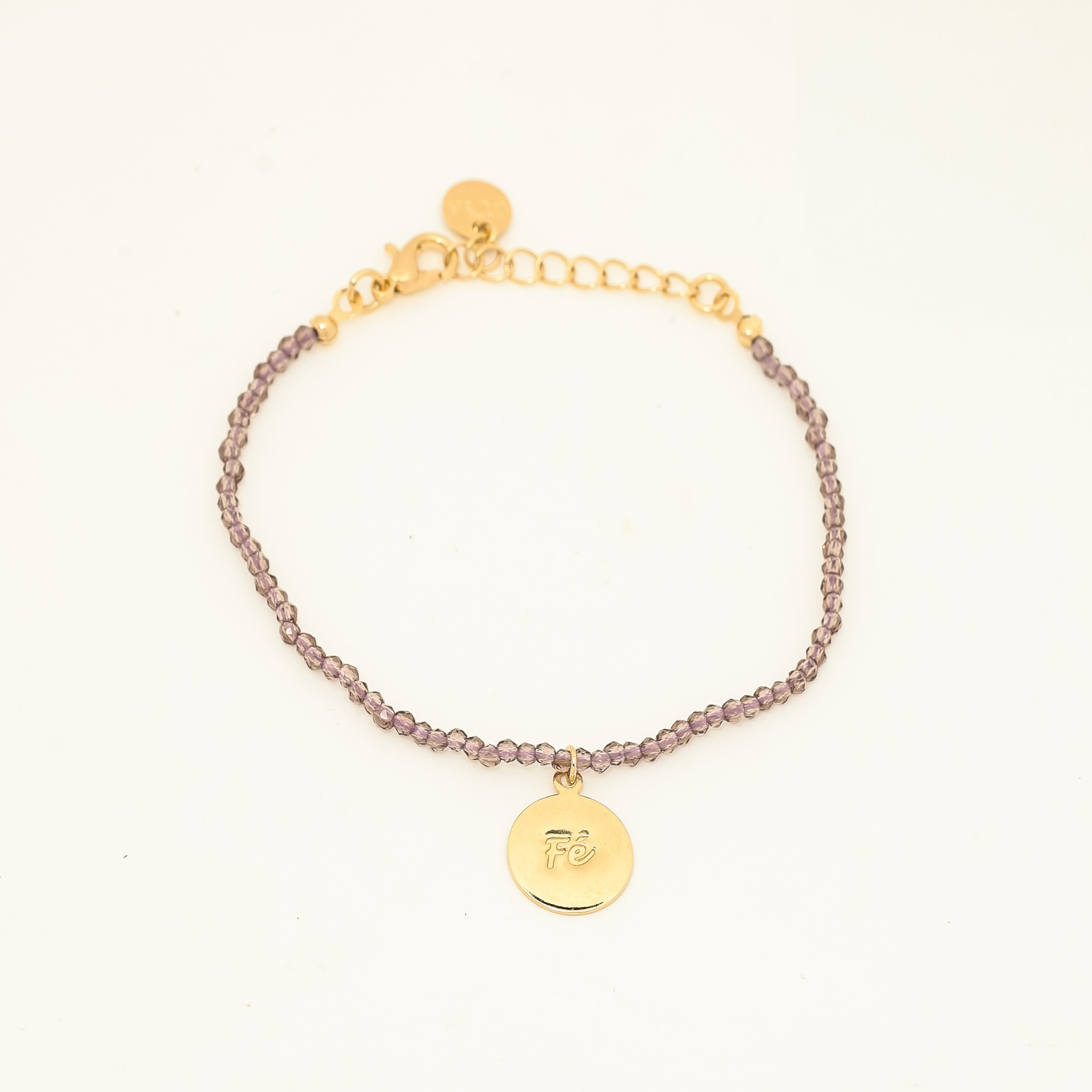 pulseira de cristal lilás com pingente escrito "Fé" em baixo relevo.