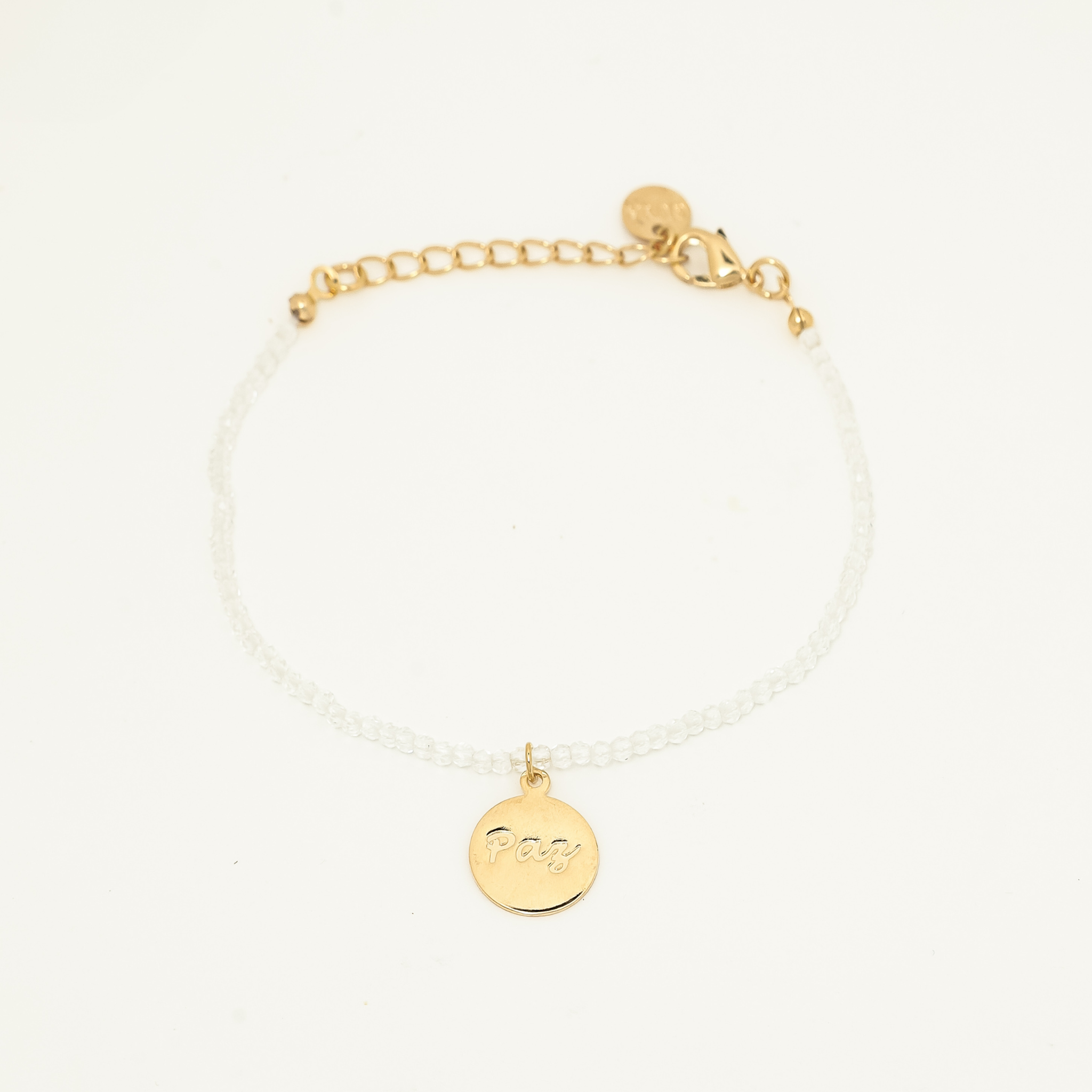 pulseira de cristal branco com pingente escrito "Paz" em baixo relevo.