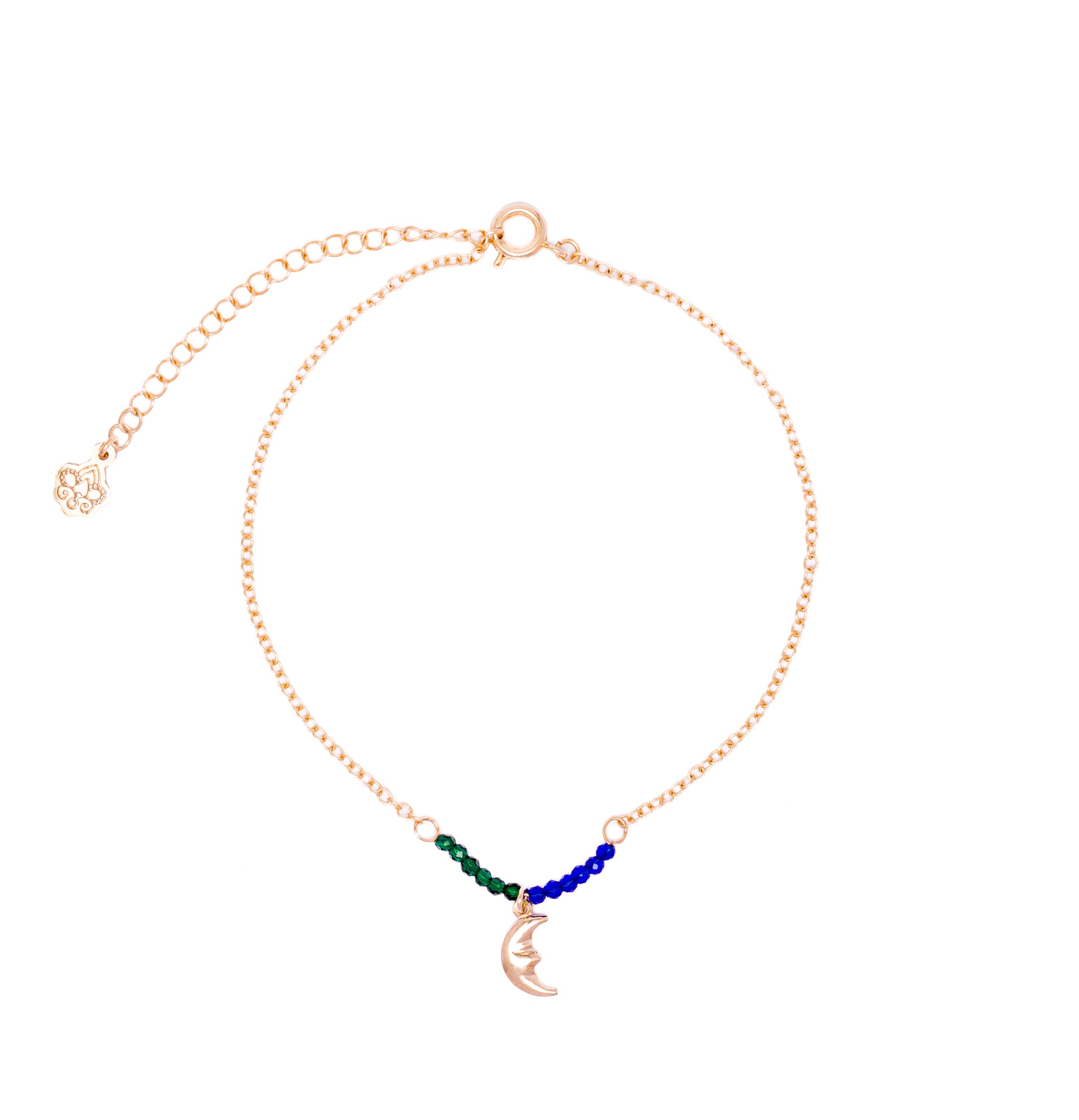 Esta tornozeleira banhada a ouro é formada por 1 camada delicada de corrente com pingente de lua entre pequenos cristais nas cores azul e verde.