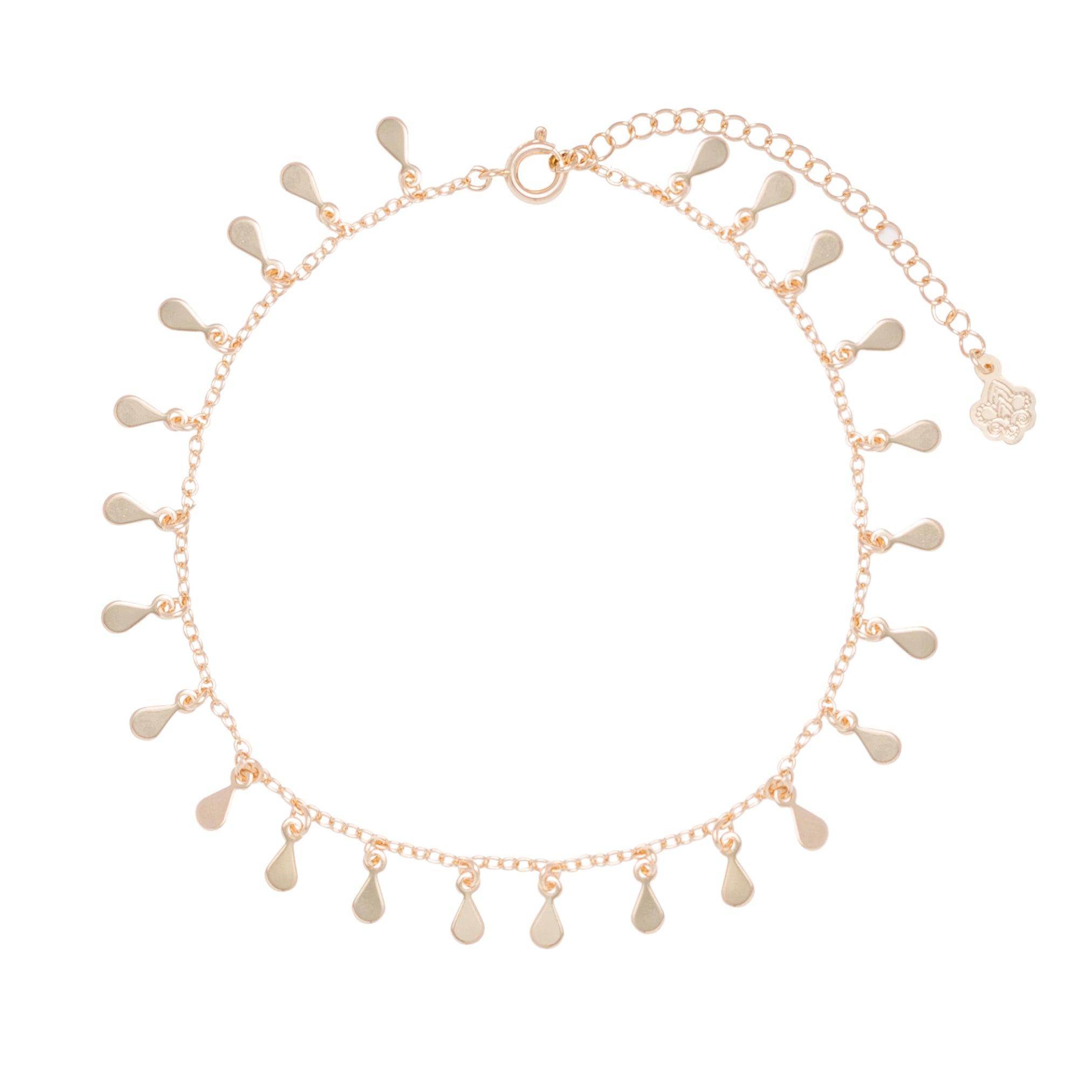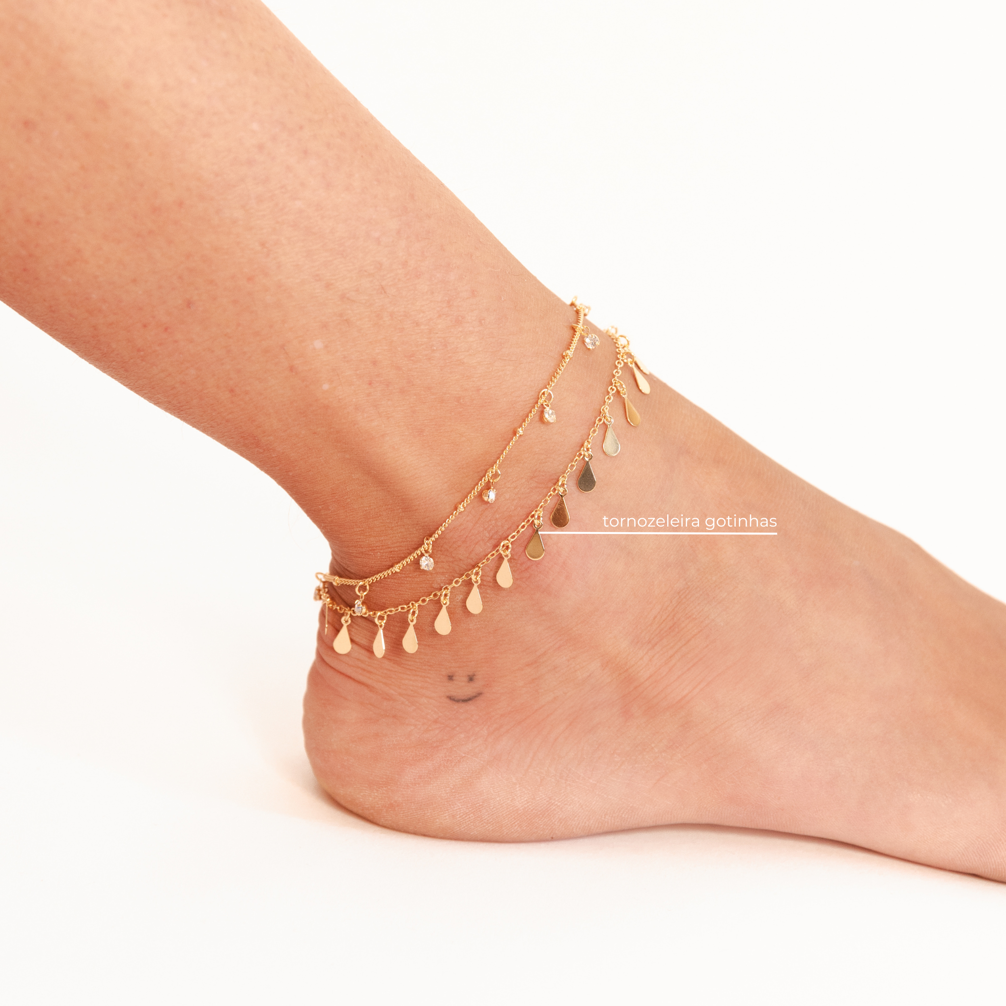 Esta tornozeleira banhada a ouro é formada por 1 camada delicada com pingentes de gotinhas que adicionam um brilho sutil e sofisticado.